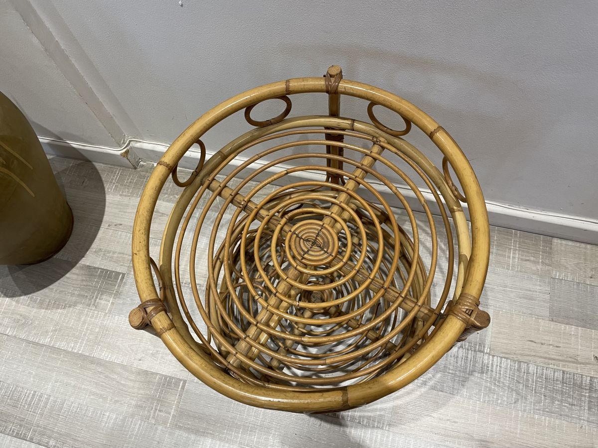 Petit bar de salon en rotin des années 70, superbe patine, hauteur 50cm, diamètre 45cm, 3 porte-bouteilles sur le plateau du bas, très bon état.