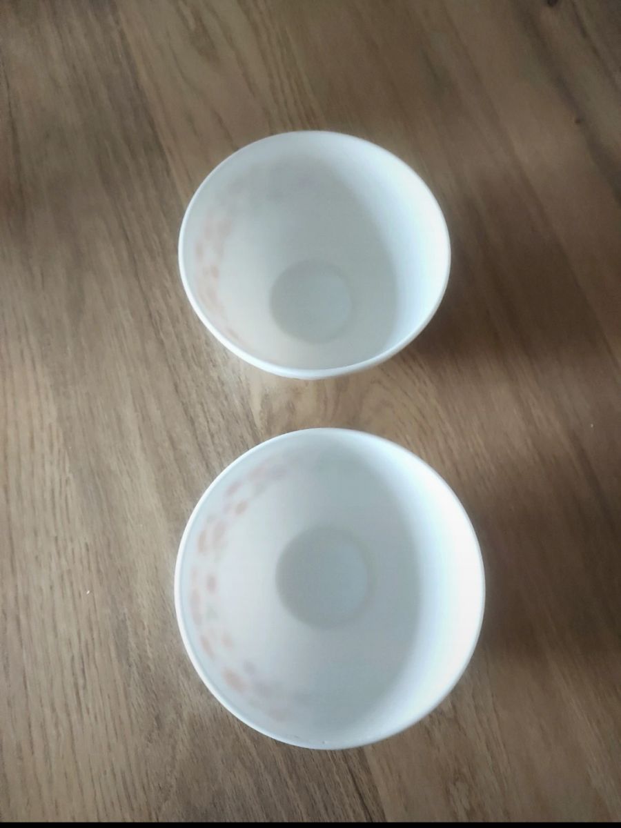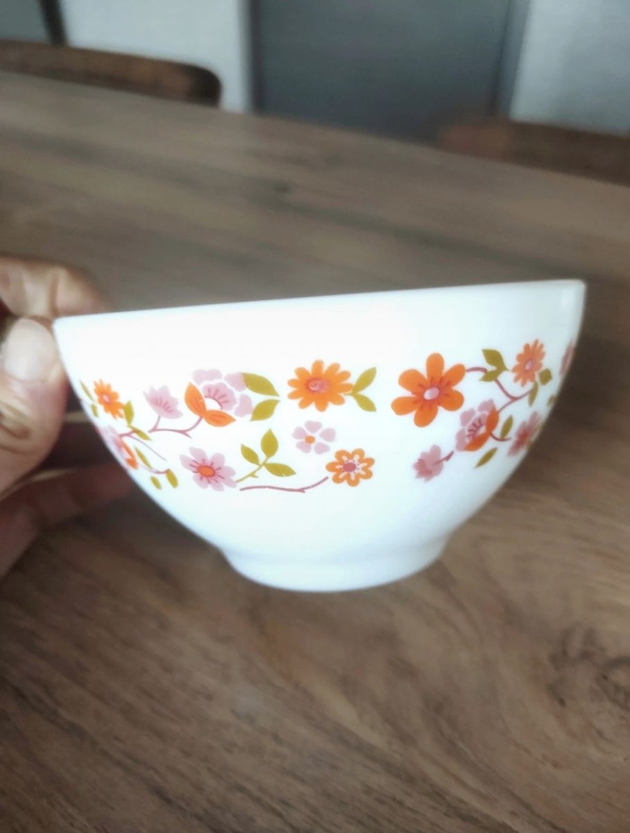 2 bols modèle Scania d'ARCOPAL en opaline avec déco fleurs oranges et roses. Années 70. Ils mesurent 13 cm de diamètre sur 7 cm de hauteur