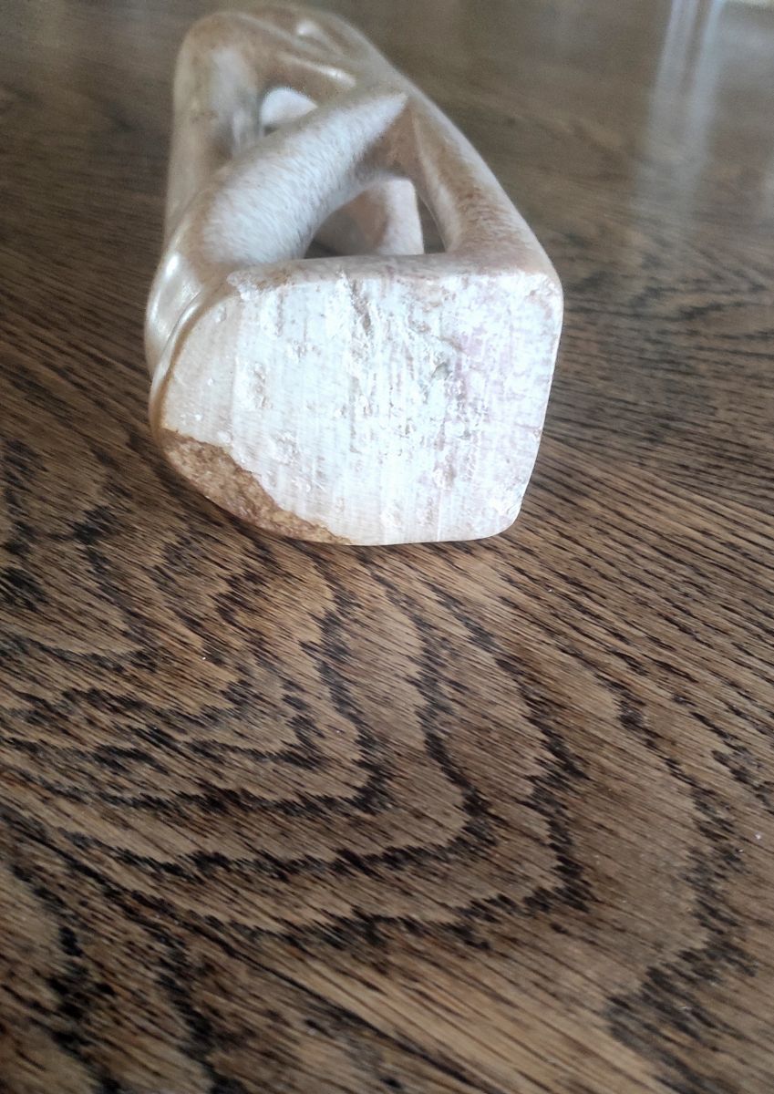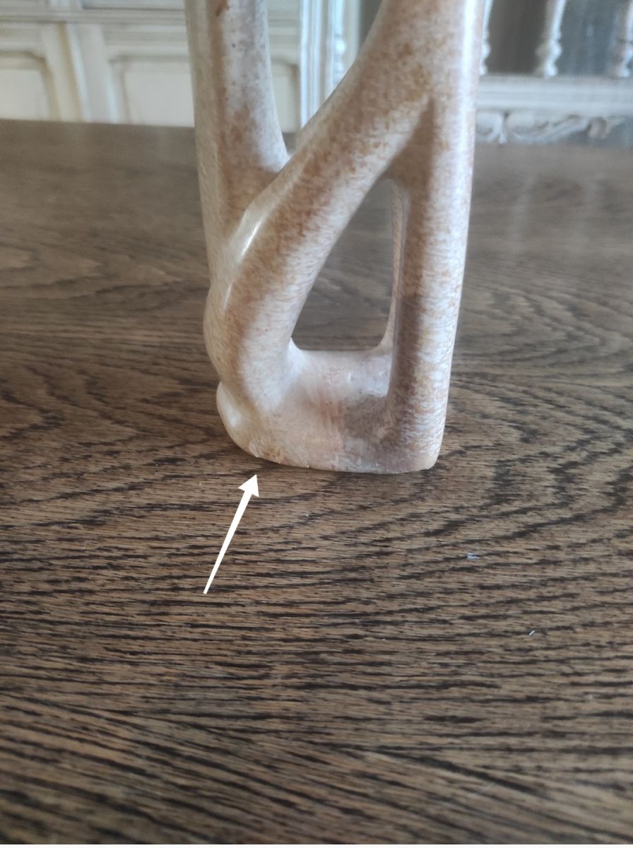 Un petit manque en bas de la statuette qui se voit peine comme vous pourrez le constater sur la photo avec la flèche. Ainsi que sur le dessous mais celle ci ne se voit pas du tout. Elle reste très élégante.