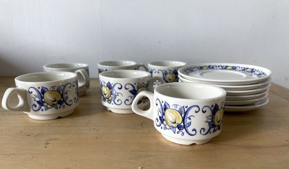 Élégance rétro des années 70 avec ce lot de 6 tasses à café et leur soucoupe estampillées Villeroy et Boch modèle Cadiz, une pièce réalisée en exclusivité pour Clacquesin. Les tasses présentent un motif délicat de grenades associé à des arabesques en forme de C, dans des tons bleus et jaunes. Elles ont non seulement une esthétique charmante mais aussi une utilisation pratique.