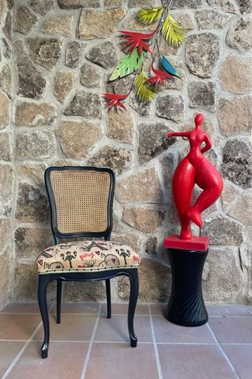 La toile de jute imprimée est en parfait accord avec l’osier, dans son état d’origine (nettoyé et ciré). Le cadre de la chaise et ses pieds sont peints en couleur noire, pour une touche moderne et élégante. Le coté naturel de cette chaise lui confie un aspect nature pour s’intégrer plus facilement dans n’importe quel espace et environnement.