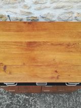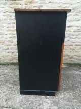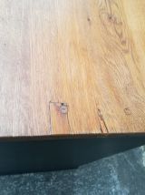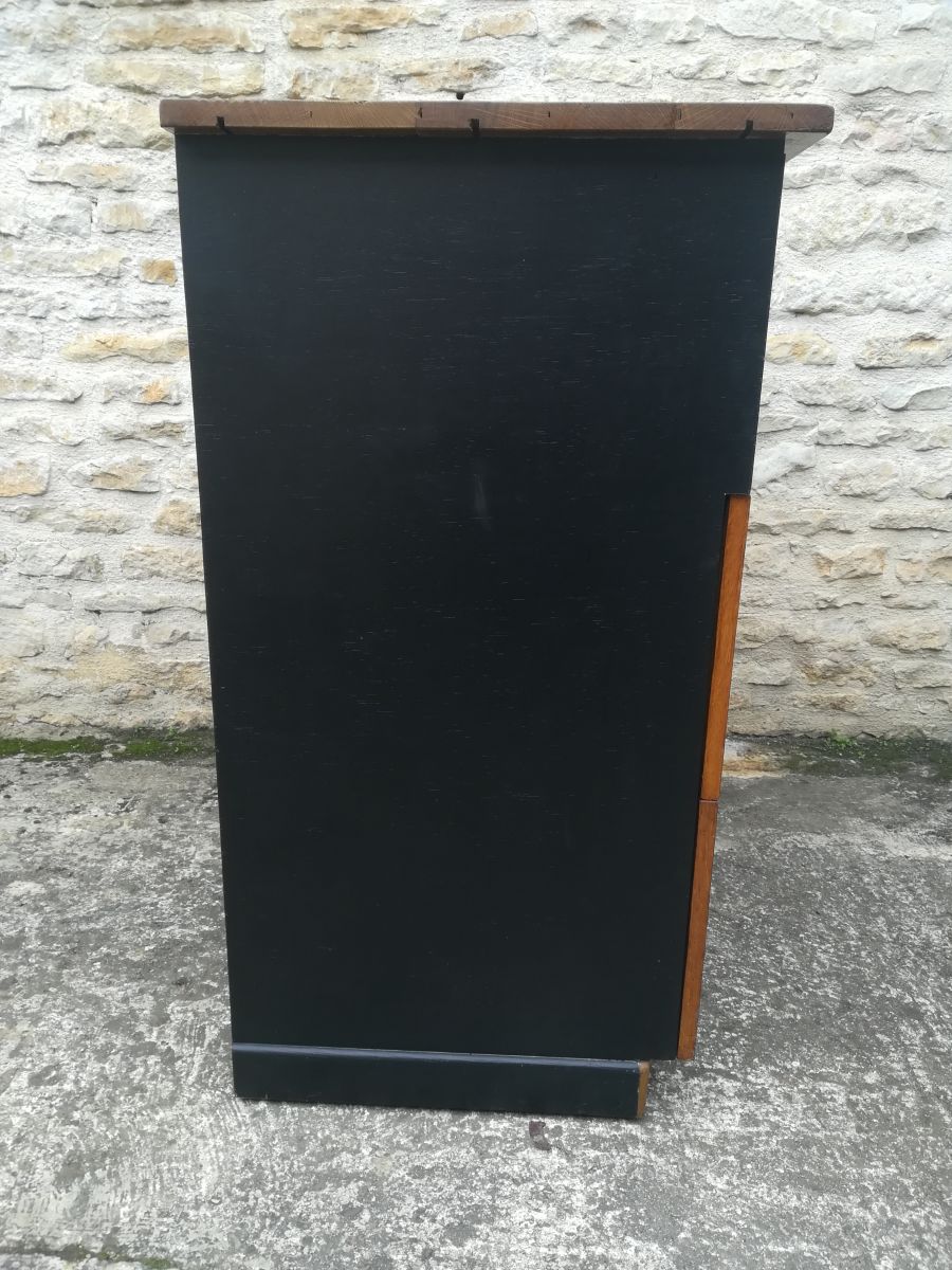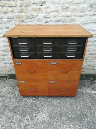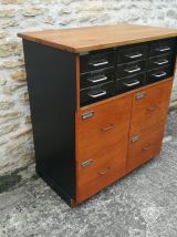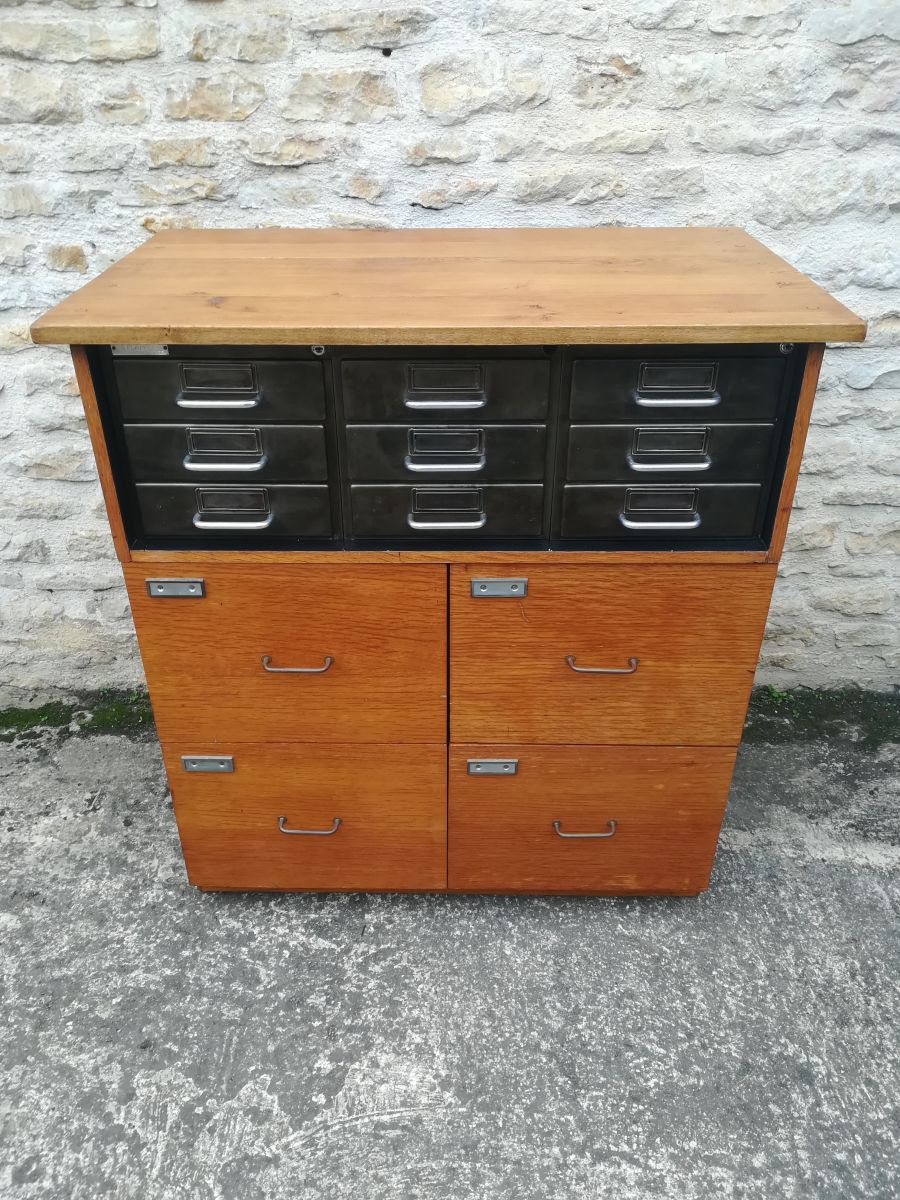 Meuble de métier en chêne et métal a 4 tiroirs en bois et 9 tiroirs en métal , le meuble a été entièrement restauré, les côtés sont patiné en noir , la façade des tiroirs en métal a été décapé ,traité et huilé . les façade des tiroirs bois et le plateau sont vernis , tout les tiroir fonctionnent bien .9 poignées en aluminium pour les tiroirs métallique , 4 poignées en laiton pour les tiroirs en bois , le tout est en bonne état , quelques rayures sur les tiroirs bois et deux pièces de bois ont été rajouté sur le plateau voir les photos . manque les clés et une serrure pour les tiroirs métallique .dimensions : longueur 97 cm x profondeur 57,5 cm x hauteur 107,5 cm .
