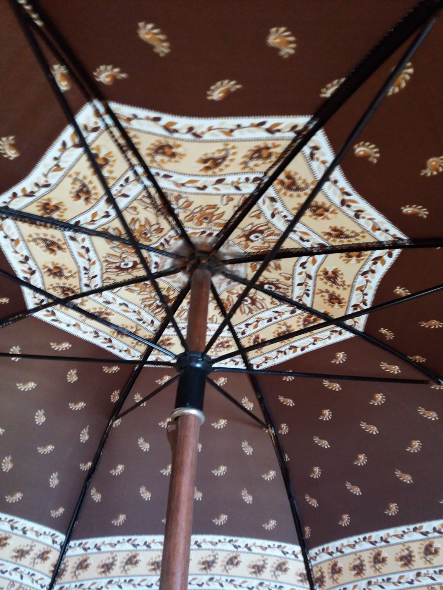 Charmant parapluie vintage avec des motifs dans des tons marron, caramel, beige et écru. Il comporte une étiquette « Parapluie de France » et une autre qui indique « made in France ». Il paraît en bois mais il me semble qu’il s’agit plutôt d’une matière plastique dure imitant le bois. Il doit dater des années 60 ou 70. Il est tout à fait fonctionnel et solide, le tissu imperméabilisé ne comporte pas de déchirure. Mais il ne cache pas quelques signes de son âge : la peinture dorée sur l’embout de 2 cm au niveau de la pointe est largement estompée, quelques décolorations et marques sur le manche, et quelques petites taches peu visibles sur le tissu, un peu de corrosion superficielle sur les baleines en métal. Replié, il mesure 86 cm de longueur, déplié il a un diamètre de 89 cm.
