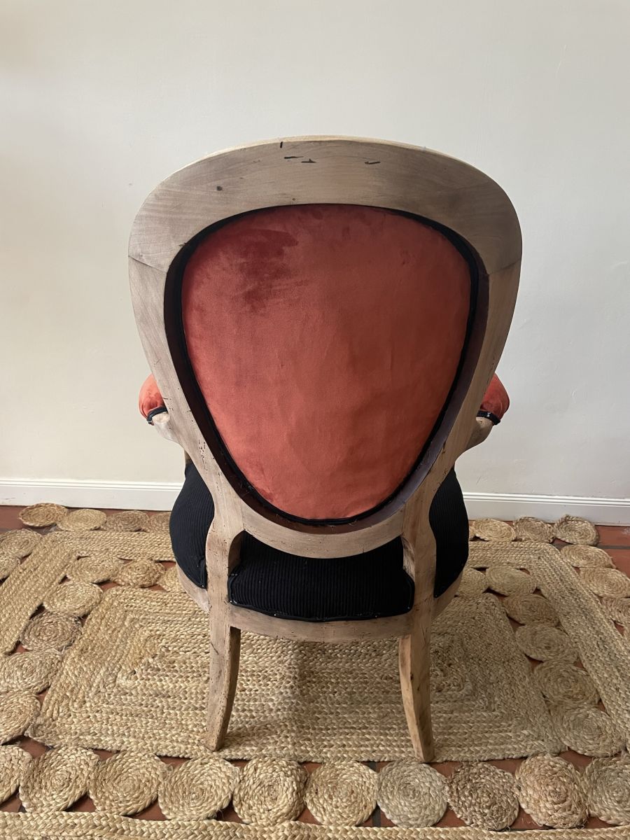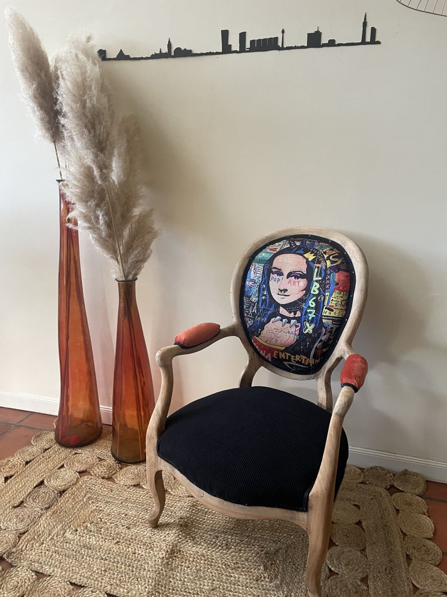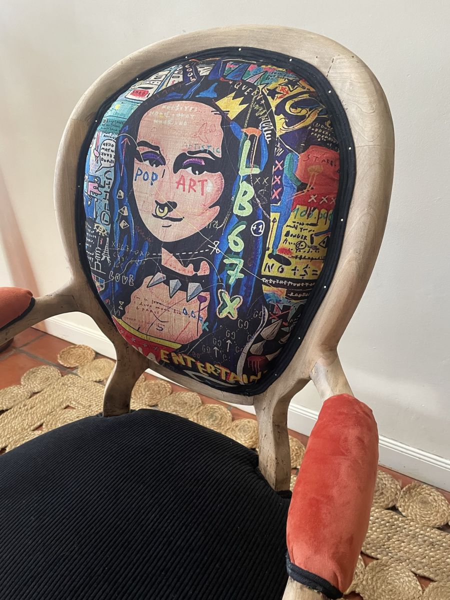 Le fauteuil a d'abord été poncé pour le laisser à l'état brut puis tapissé avec un imprimé représentant Mona Lisa. Parfait pour donner une touche moderne dans tout type d'intérieur