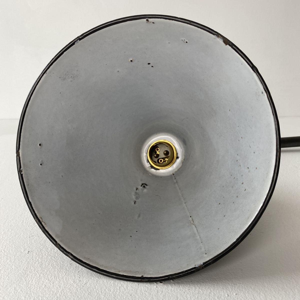 Entièrement restaurée, poncée et patinée ton anthracite. Electricité refaite à neuf avec fil noir en tissu tressé. Douille à baïonnette en laiton (B22). Interrupteur à clé sur la douille. Abat-jour en tôle émaillée noire.