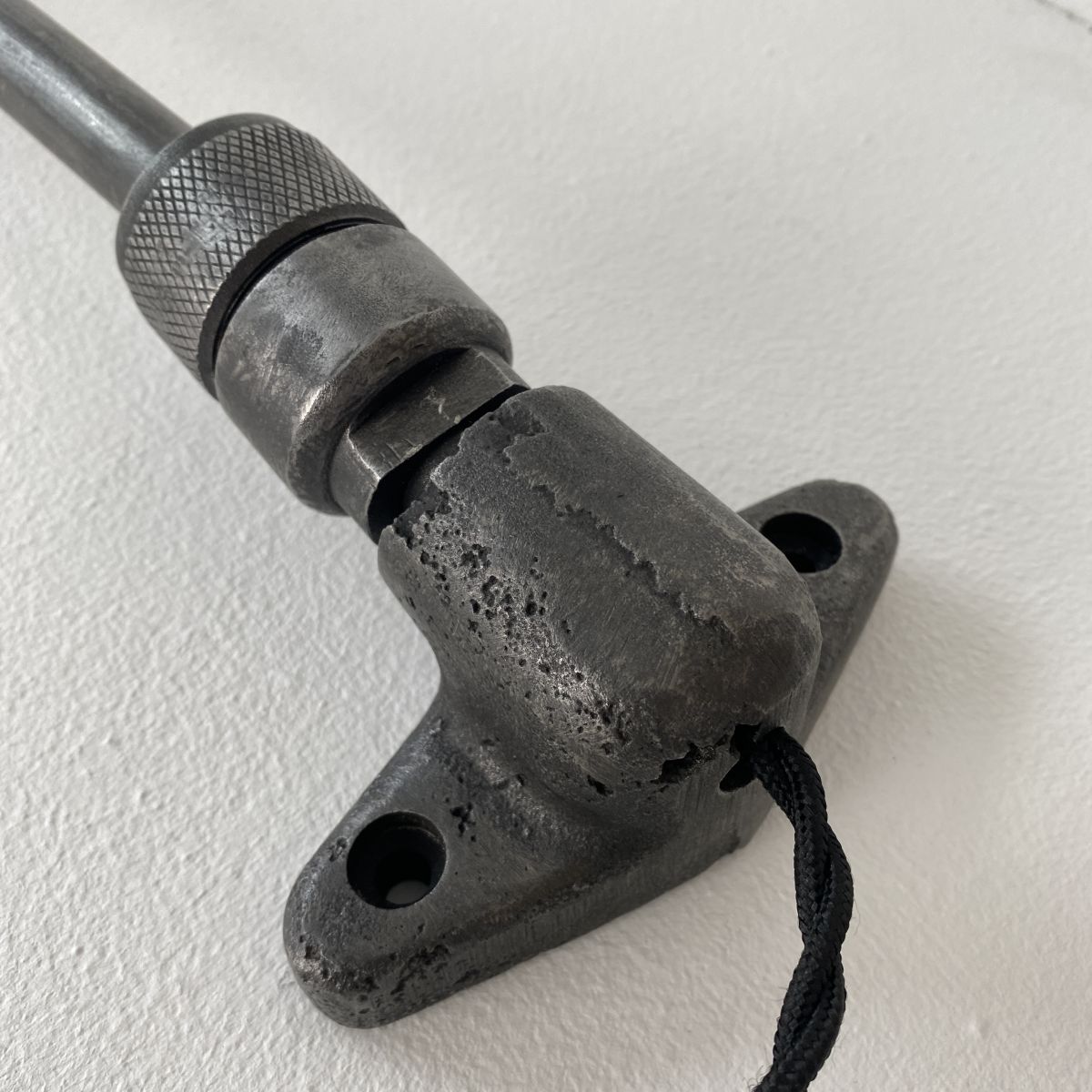 Rare applique industrielle à trois bras. Elle s’incline légèrement grâce à ses rotules sur chaque bras. Cette lampe se fixe avec fil apparent.