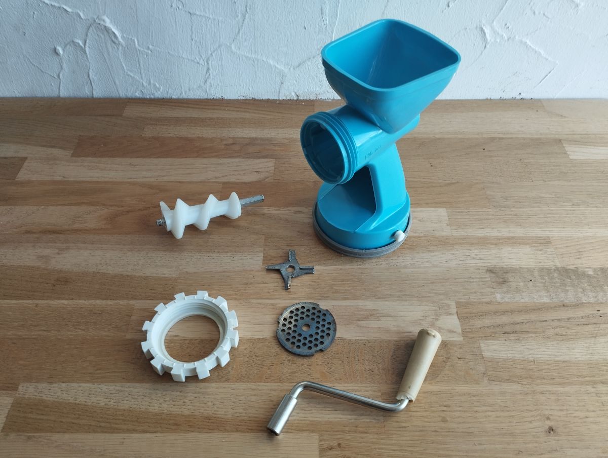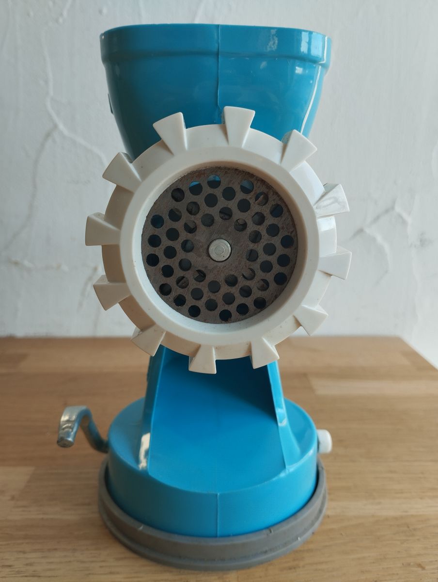 D'un beau bleu turquoise, il saura apporter une touche vintage à vos ustensiles de cuisine ! Il vous permettra également de pouvoir hacher vos viandes et cela même en cas de coupure d'électricité. Oui, l'huile de coude, ça marche toujours, enfin bon un peu moins bien quand on a de l'arthrose.