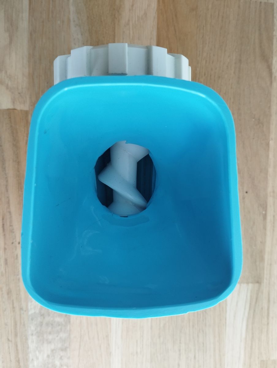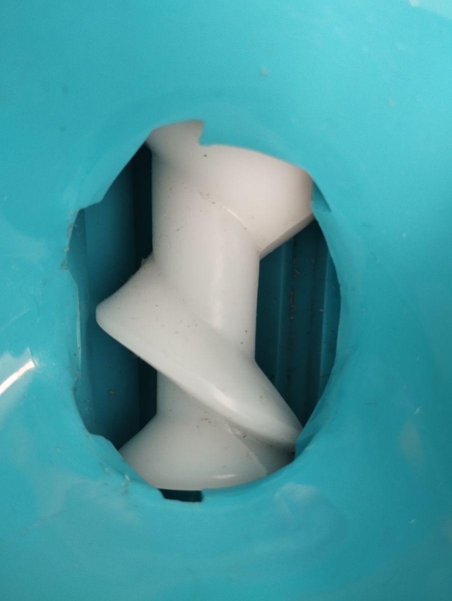 Revenons-en à nos moutons, l'objet est composé d'une meuleuse rotative, avec un couteau et une plaque perforée en métal. Le corps de la anse est également en métal, le reste de l'objet est en plastique. À la base de l'appareil, un système de ventouse permet à l'objet de ne pas bouger pendant le hachage.