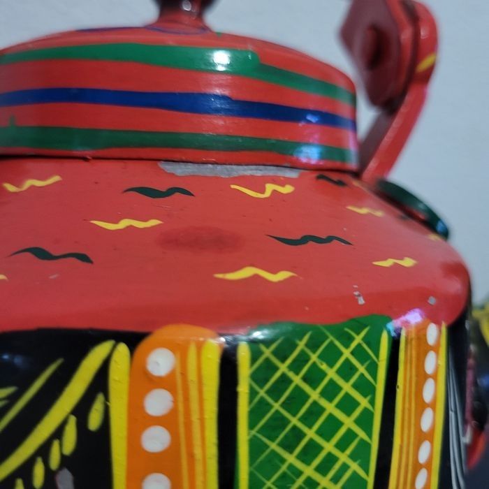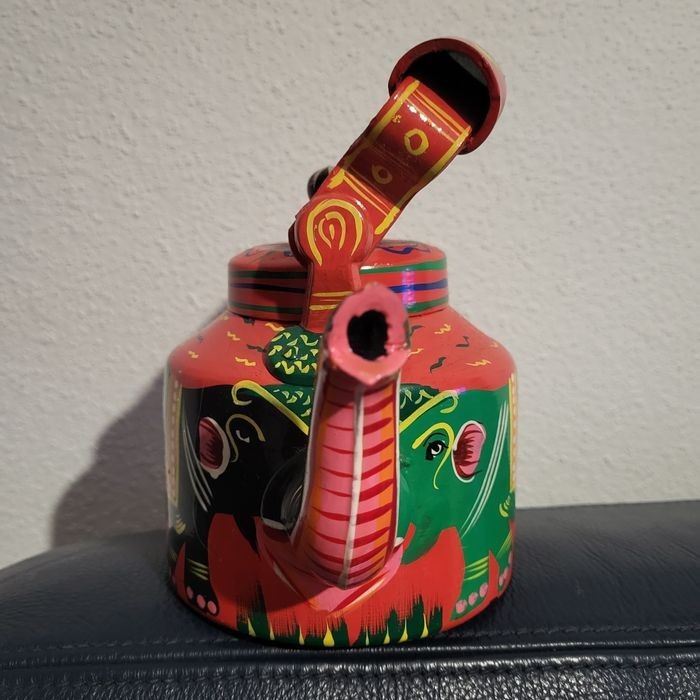 théière indienne en aluminium peint à la main par des artisans indiens, manque de la peinture sous le couvercle qui ne se voit pas quand il est posé.