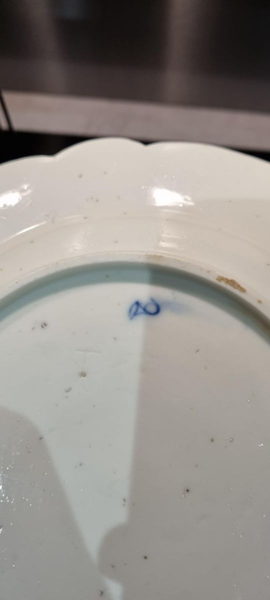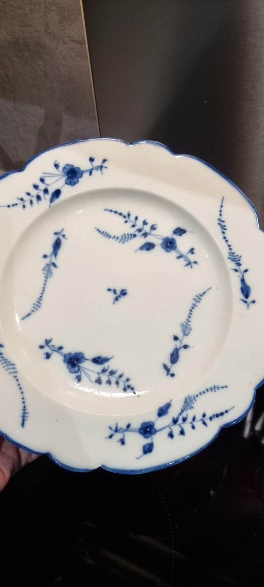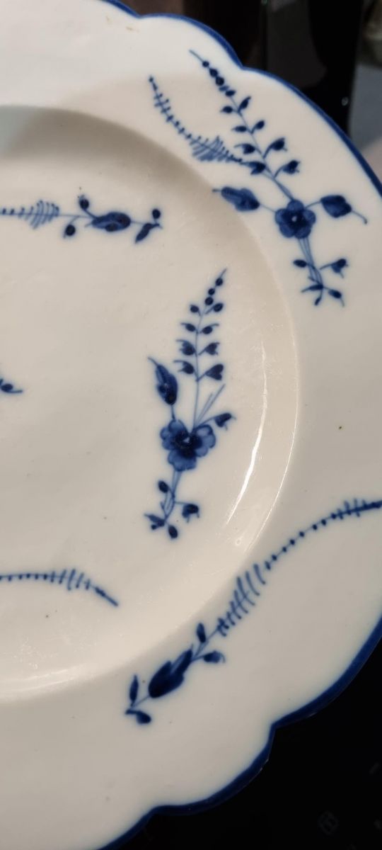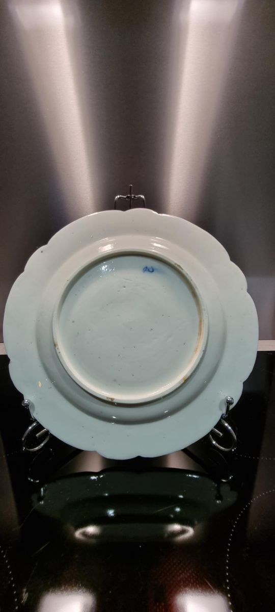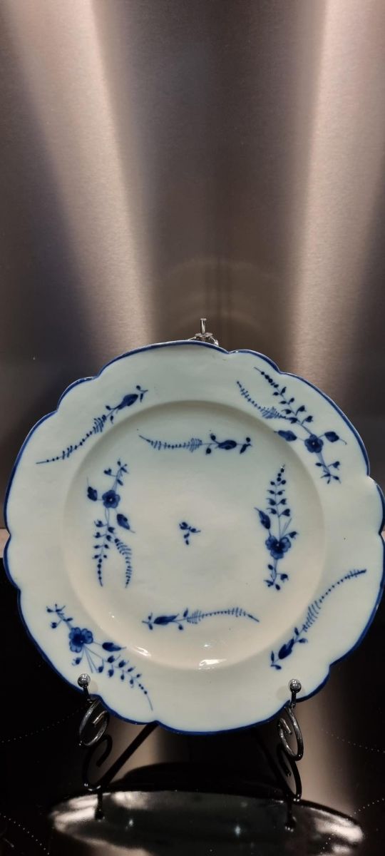 Rare assiette creuse en porcelaine de Chantilly XVIIIème décor bleu à la brindille – diamètre 24 cm – Au revers marque au corps de chasse de Chantilly.