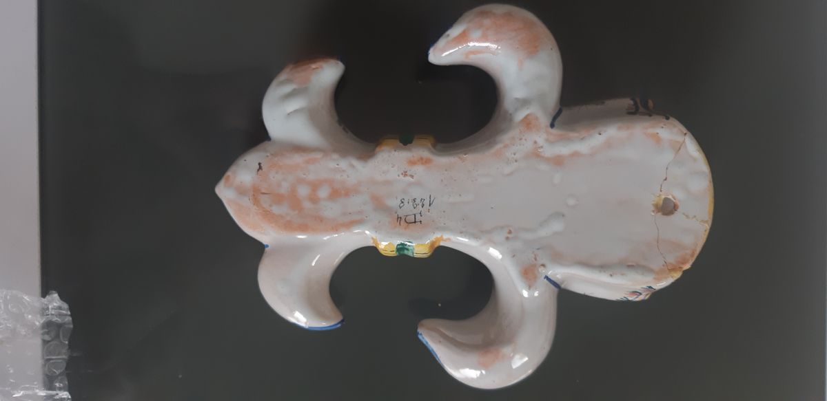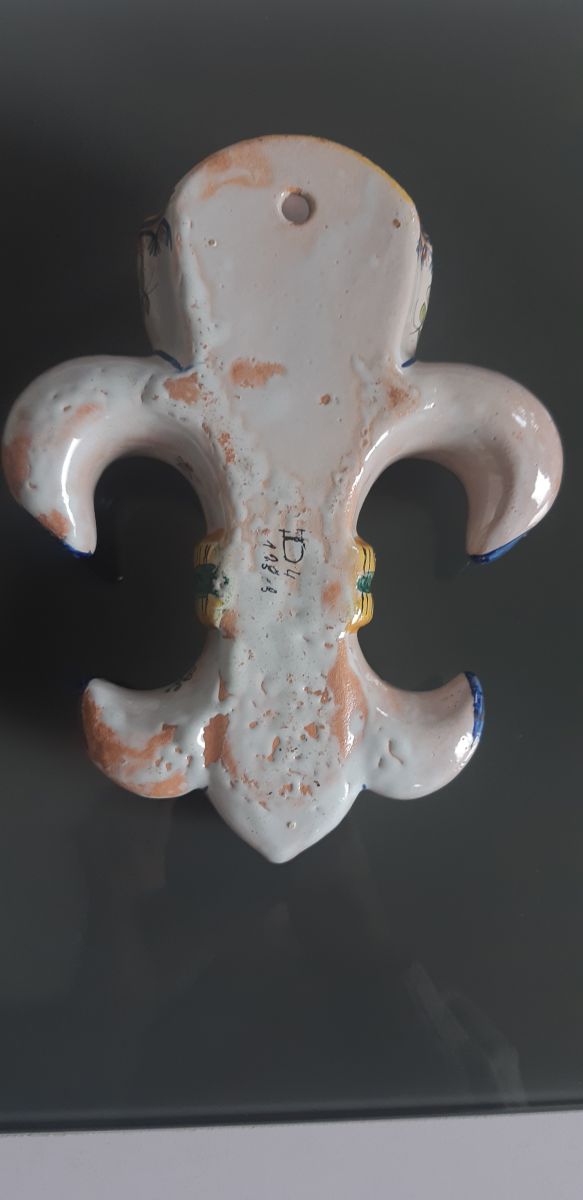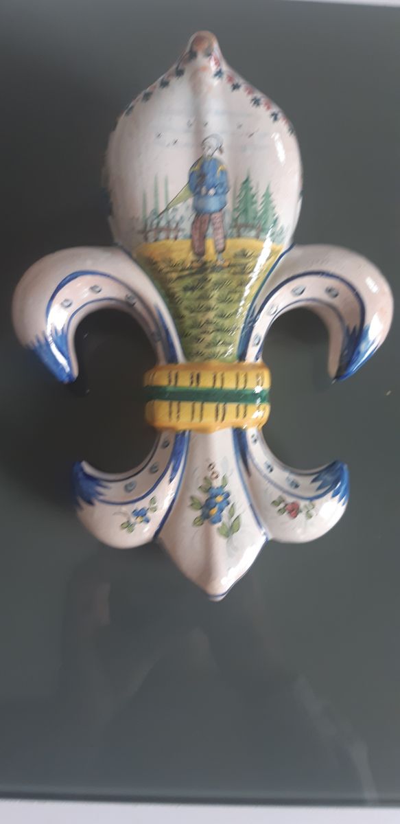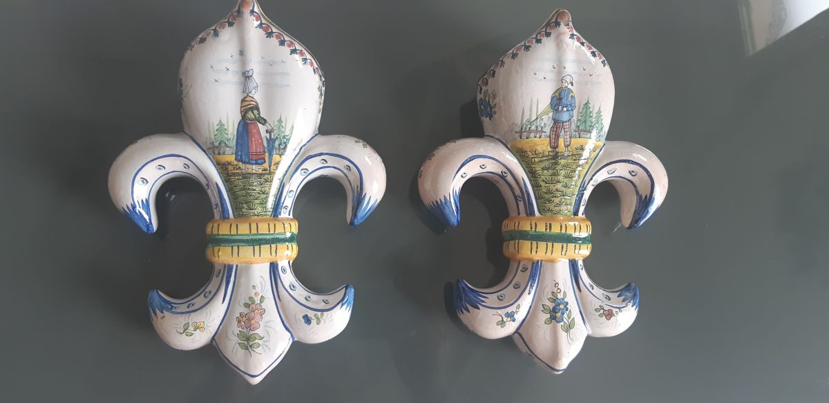 Paire de bouquetières d´applique en forme de fleurs de Lys en faience emaillée polychrome à decor de personnages dans les champs.