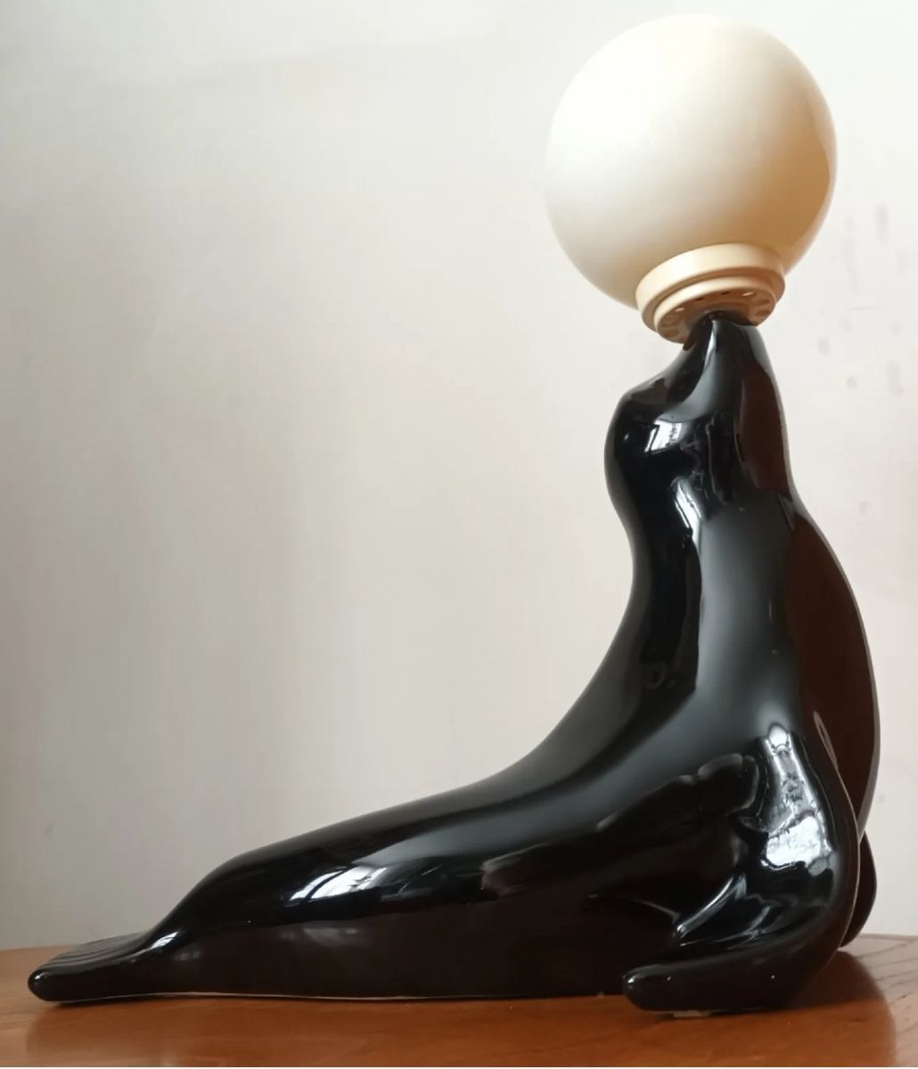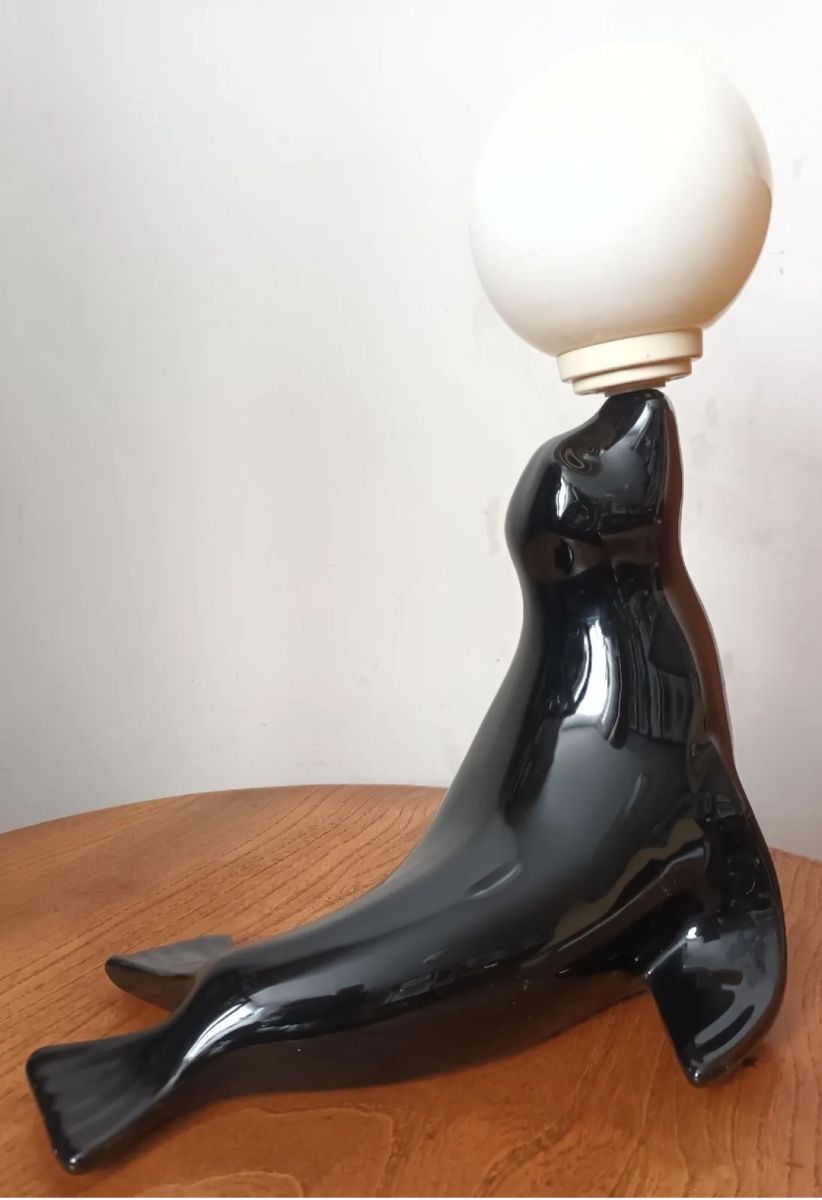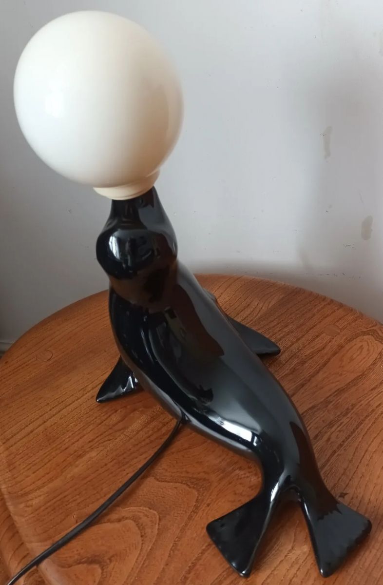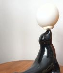 Adorable lampe otarie vintage, céramique noire et globe opaline.