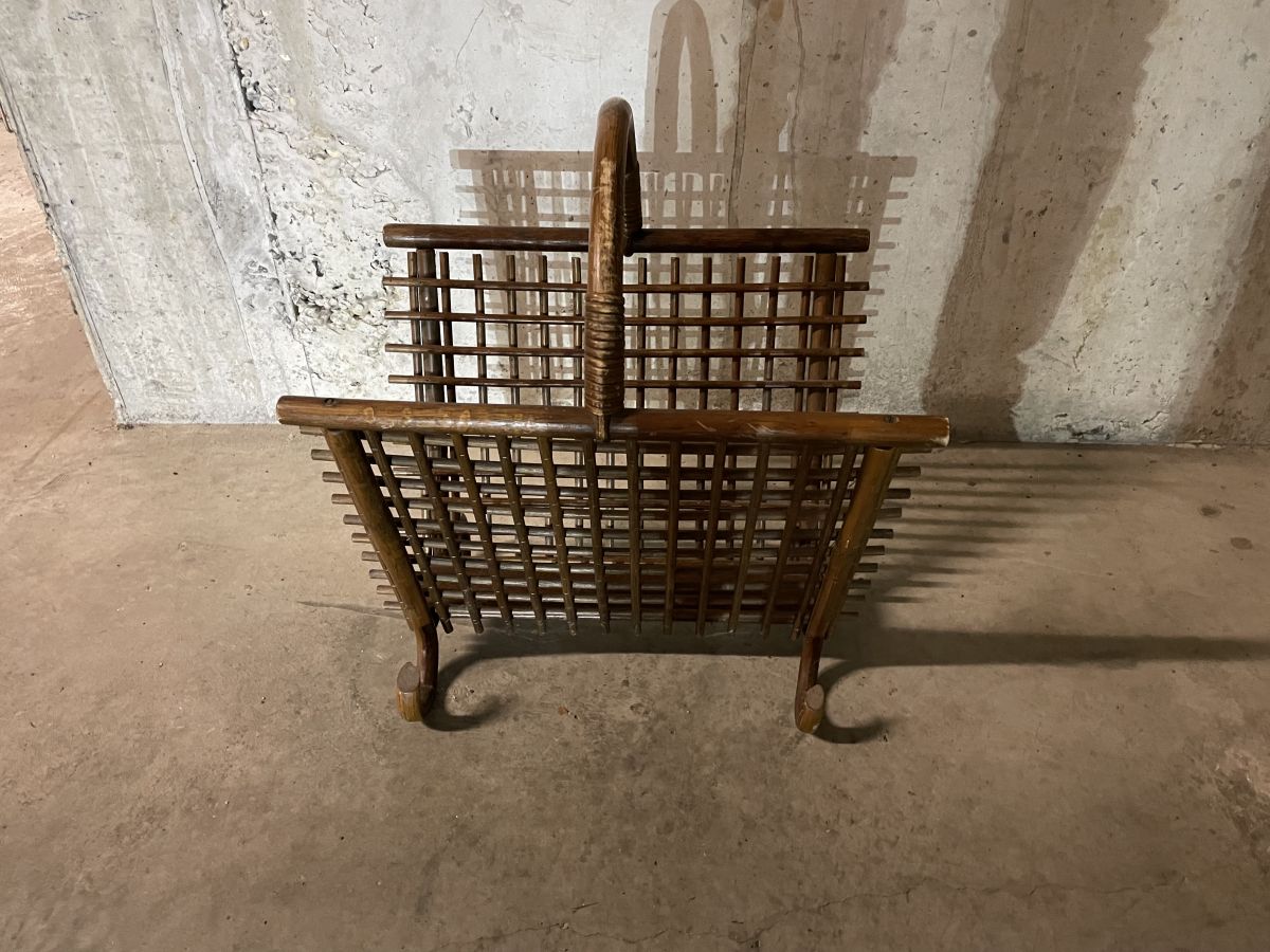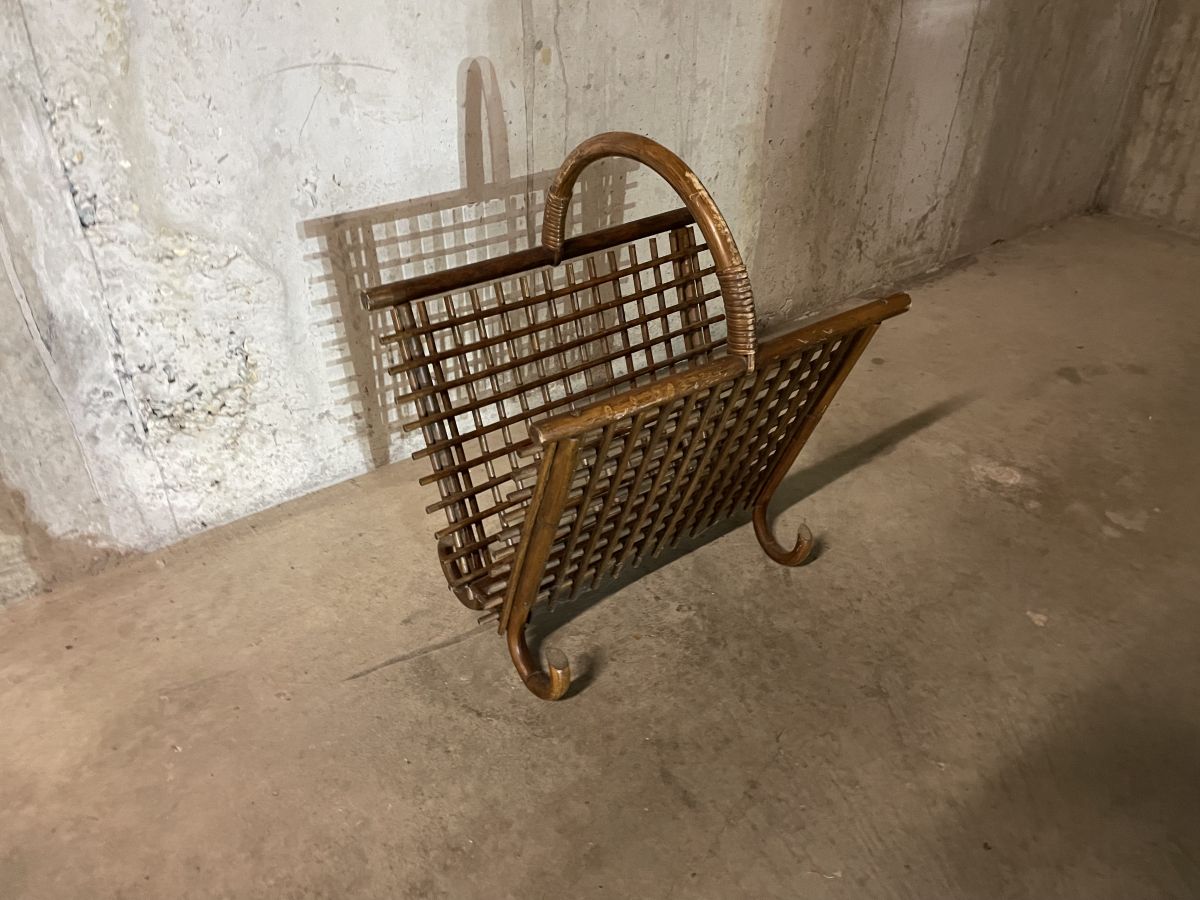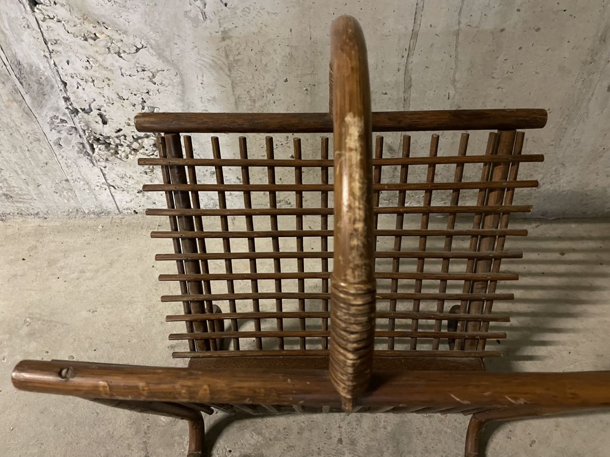 Porte-revues en rotin des années 60, dimensions (cm) : L.45xH.52xP.32, bon état.
