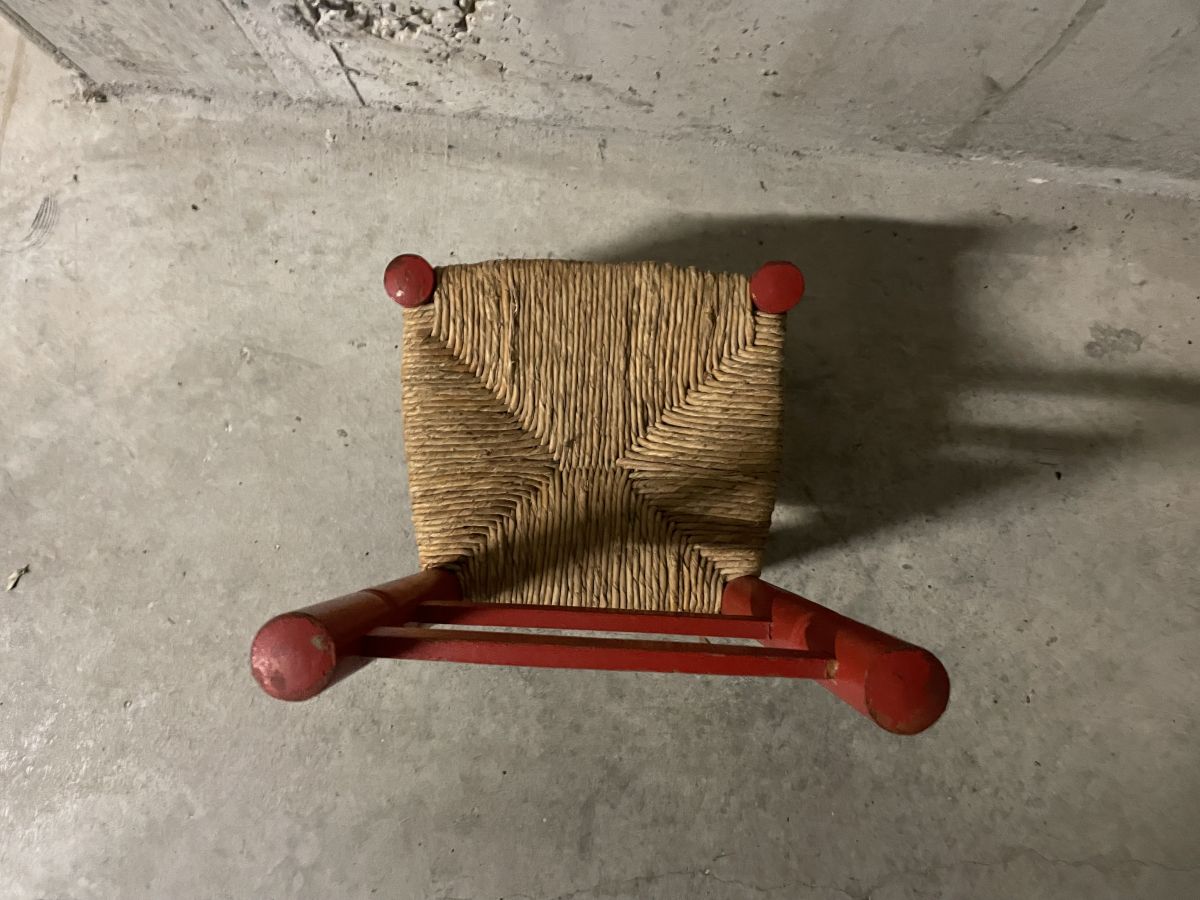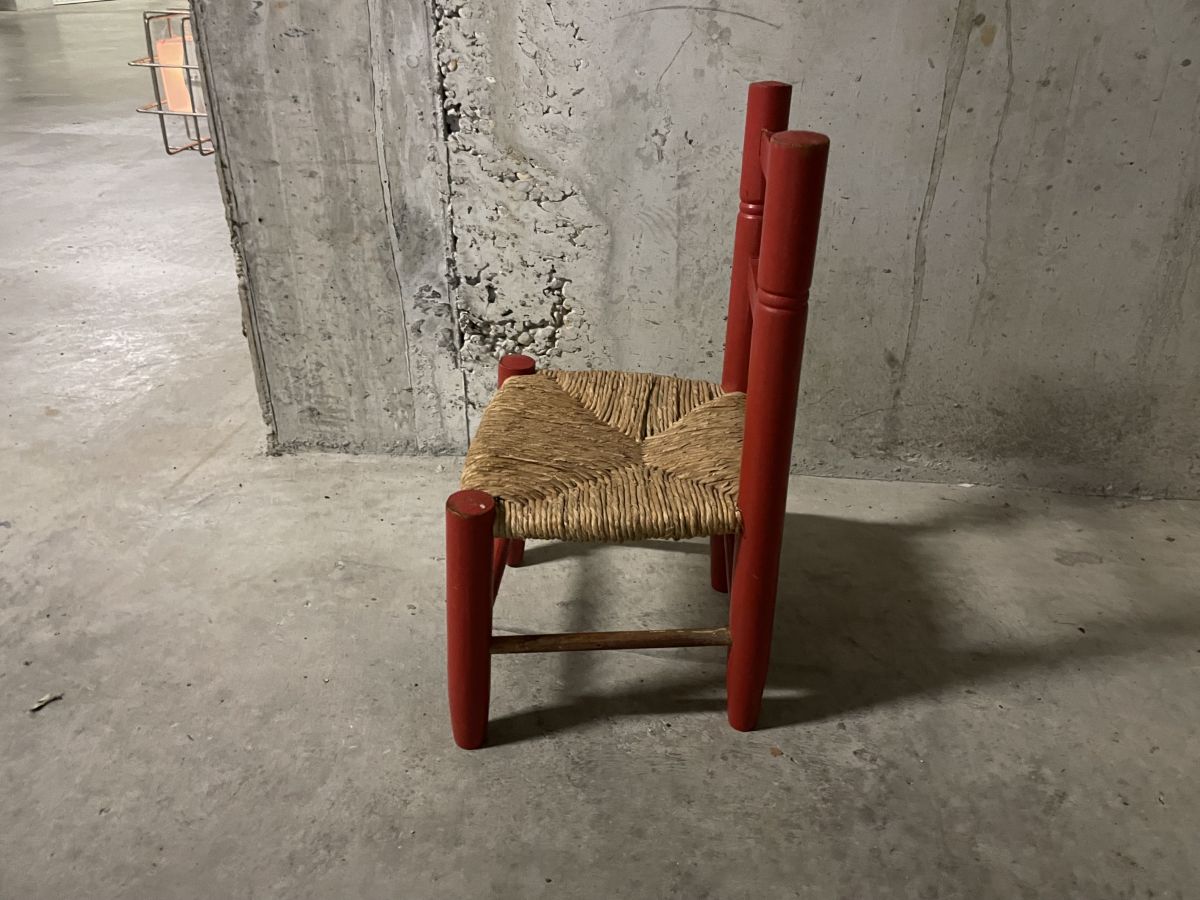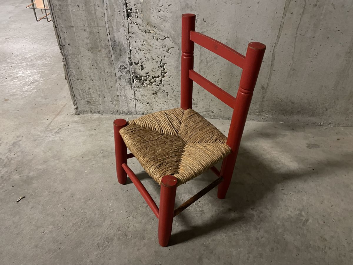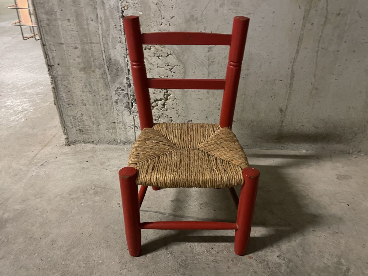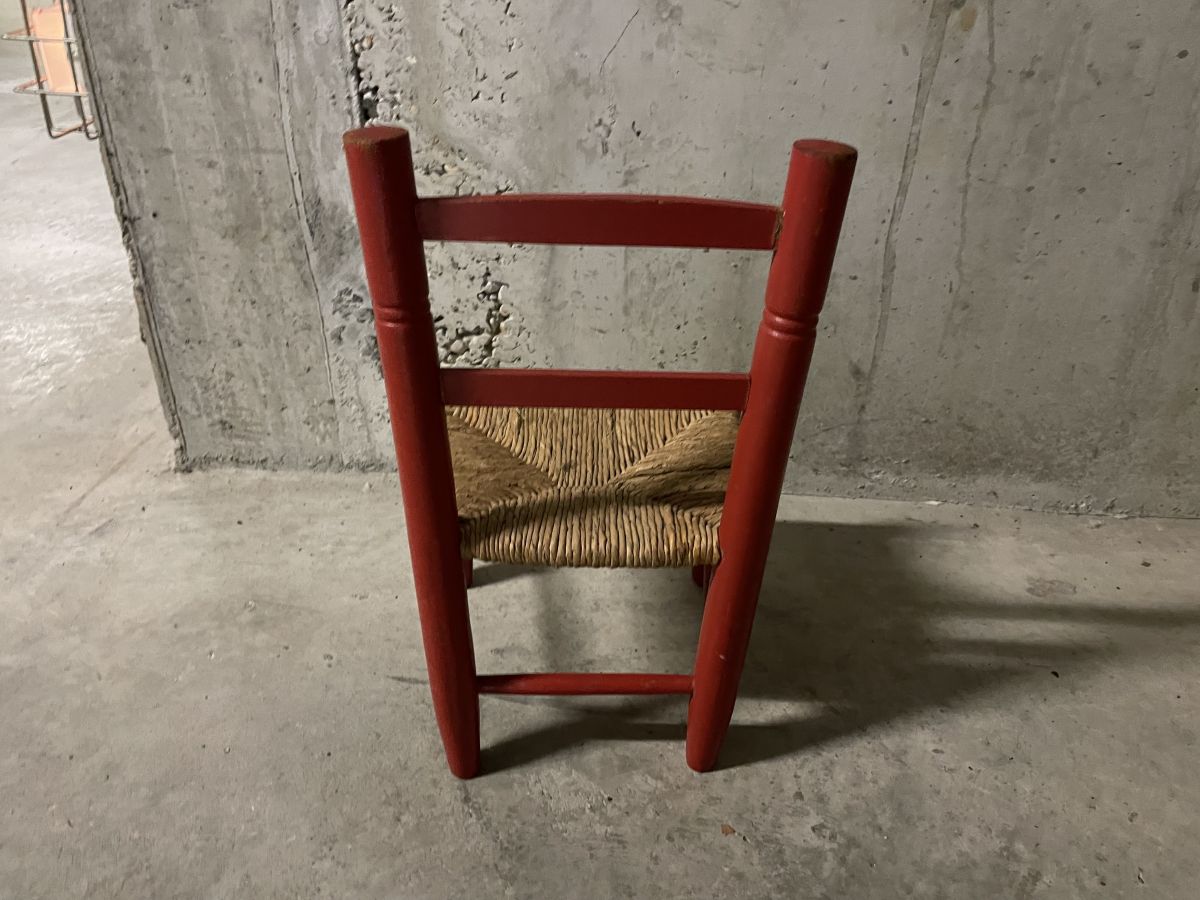 Chaise d’enfant paillée des années 50, peinte en rouge, superbe patine, traces d’usage (voir photos), hauteur totale 49cm, hauteur assise 23cm, assise 26x24cm.