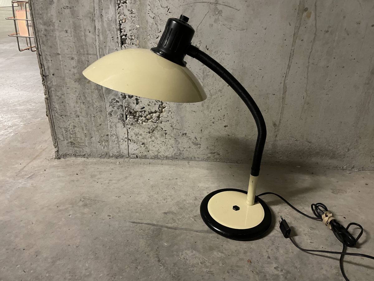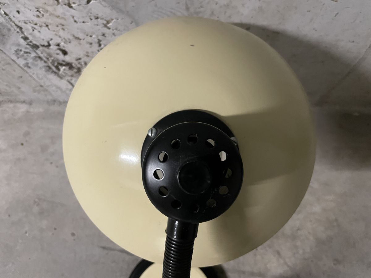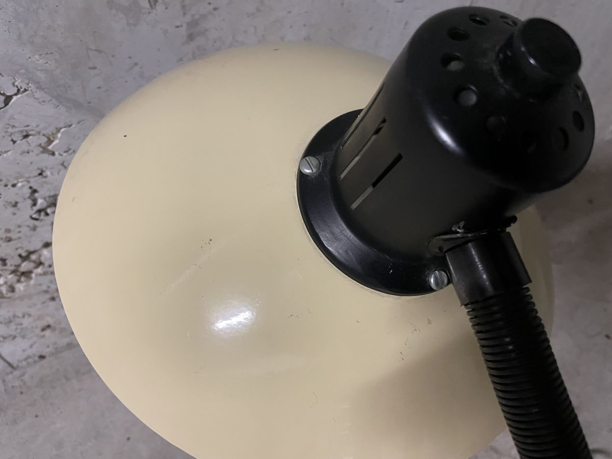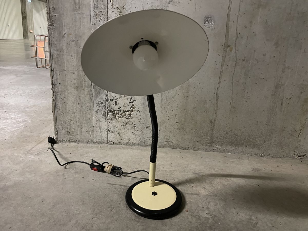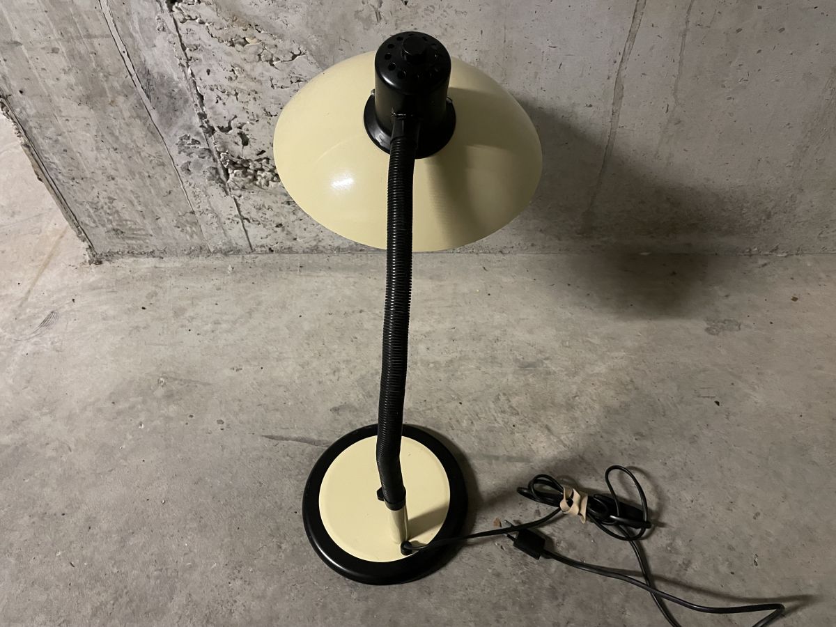 Lampe d’atelier des années 70 en métal couleur crème, tige flexible, fabrication française, fonctionne parfaitement, hauteur 55cm, diamètre abat-jour 27cm, diamètre socle 19cm, bon état.