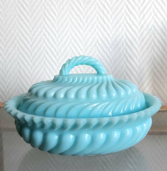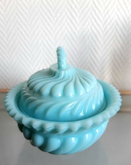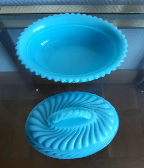 Opaline laiteuse de couleur bleue, bonbonnière à corps godronné et bordure dentelée. Prise supérieure torsadée.
