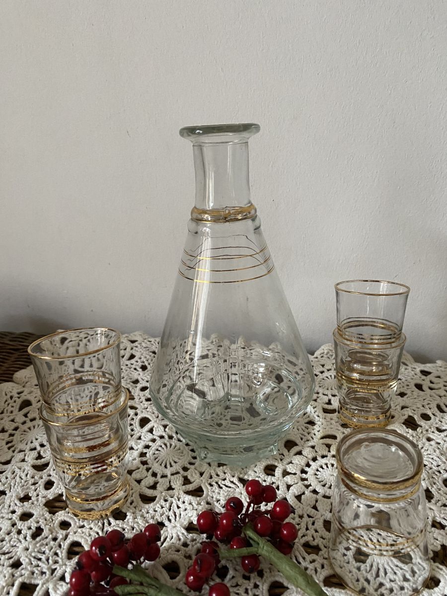 Service liqueur au liseré doré des années 60.Il se compose d une carafe au pied étoile et de 5 verres tuilor.