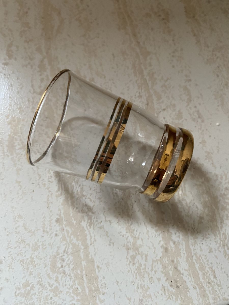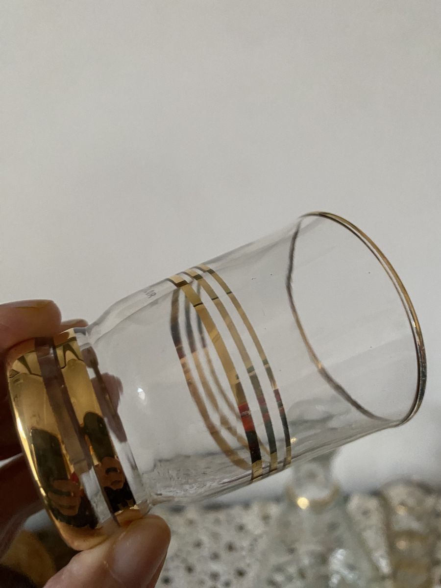 Les 5 verres sont dans un bel état, la carafe a le doré légèrement estompé par endroit.