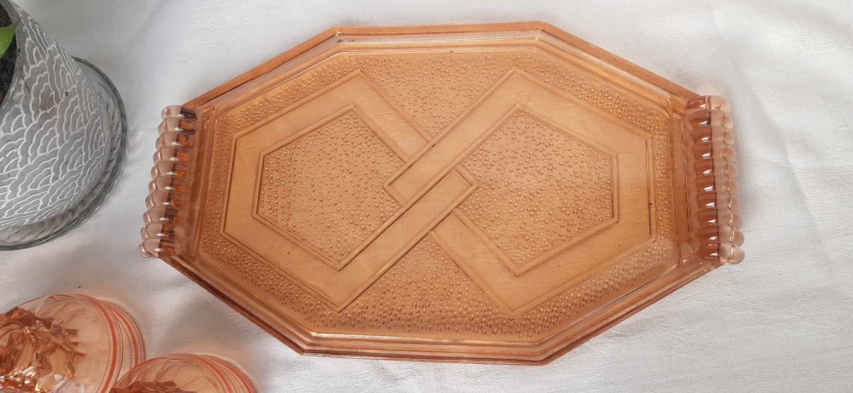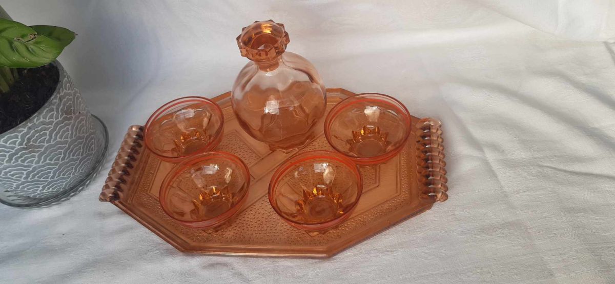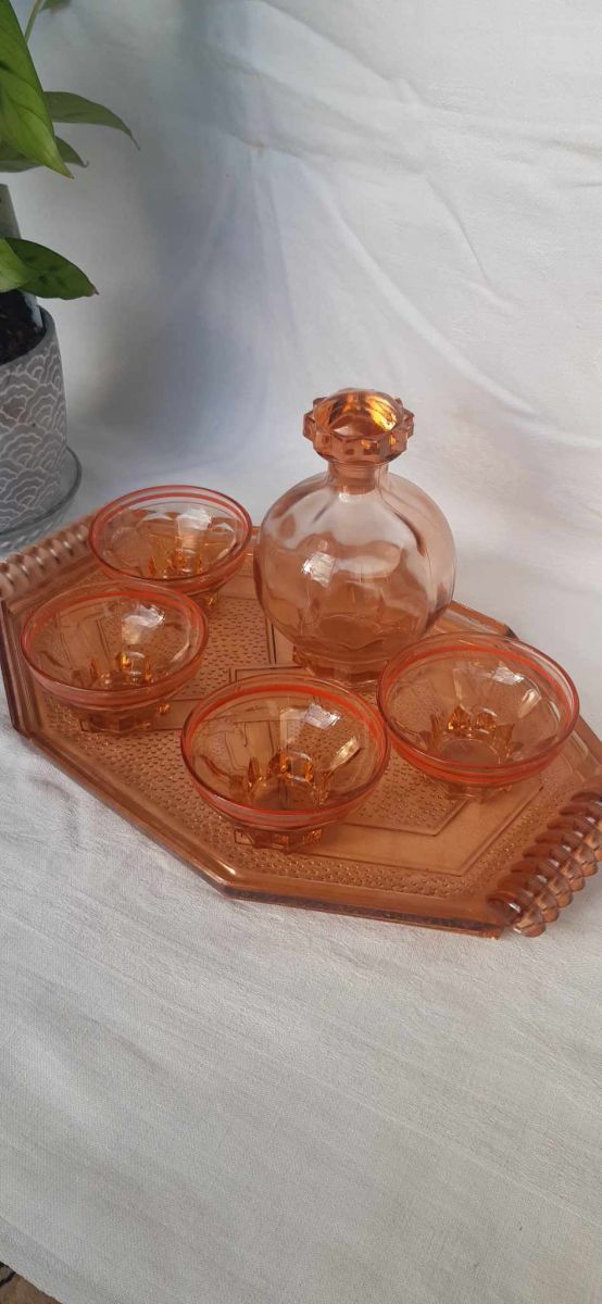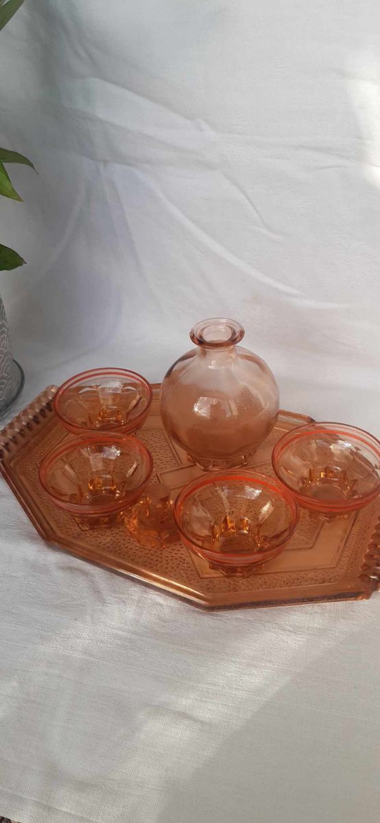 Magnifique et ancien service à liqueur en verre, art déco de couleur rose, comprenant un ensemble de 6 pièces: 1 carafe, 4 verres, et le plateau.