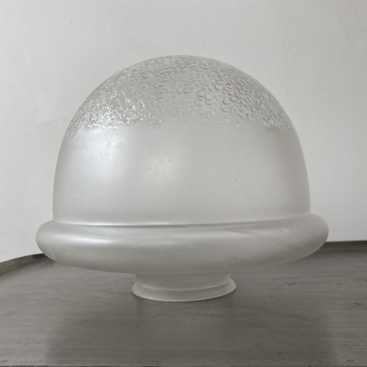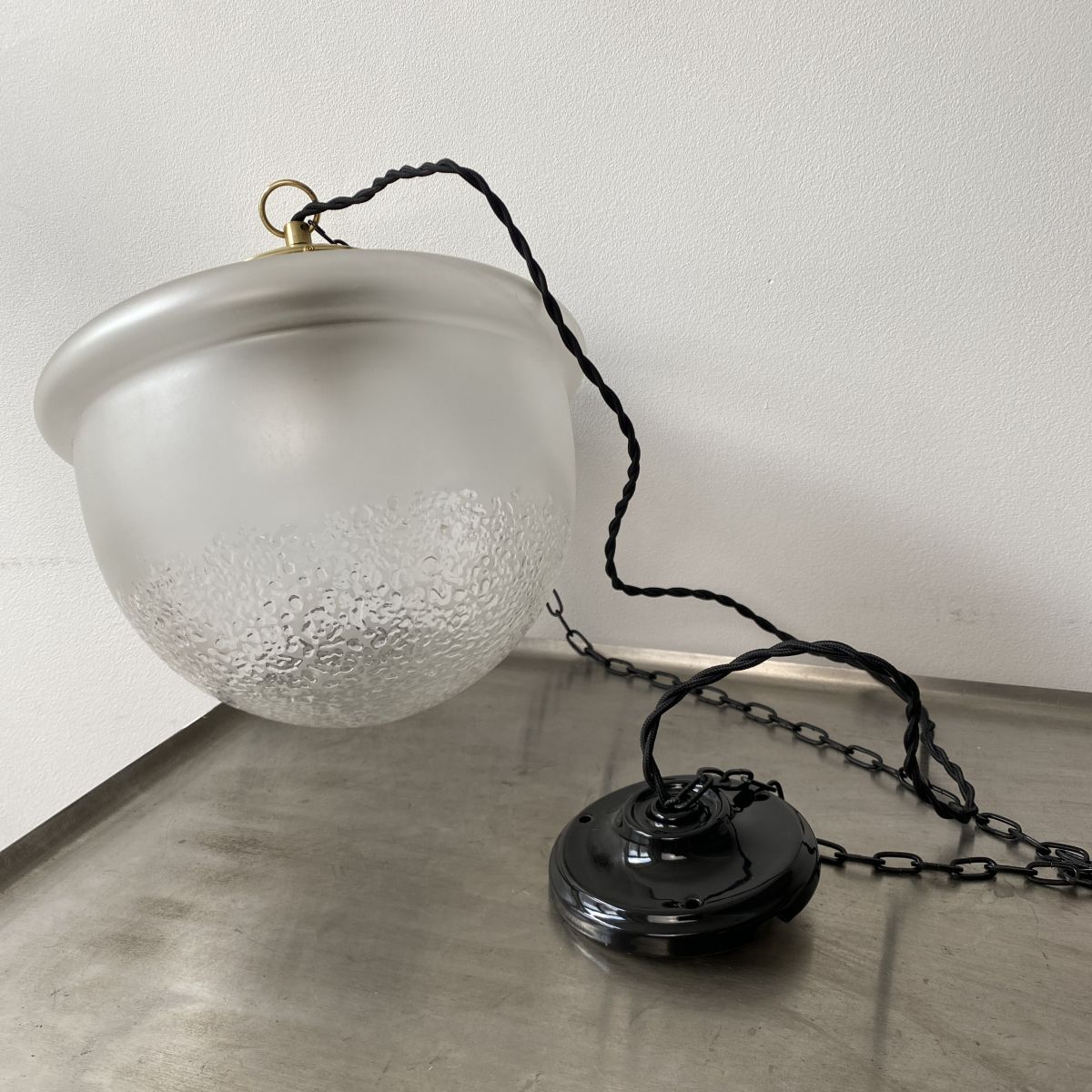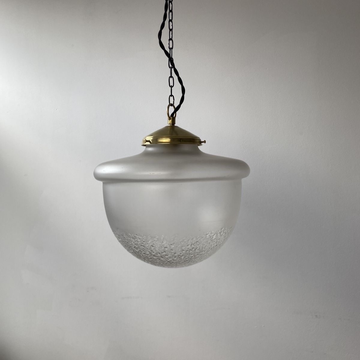 Imposante suspension Art-Déco demi boule, en verre dépoli à décor perlé.