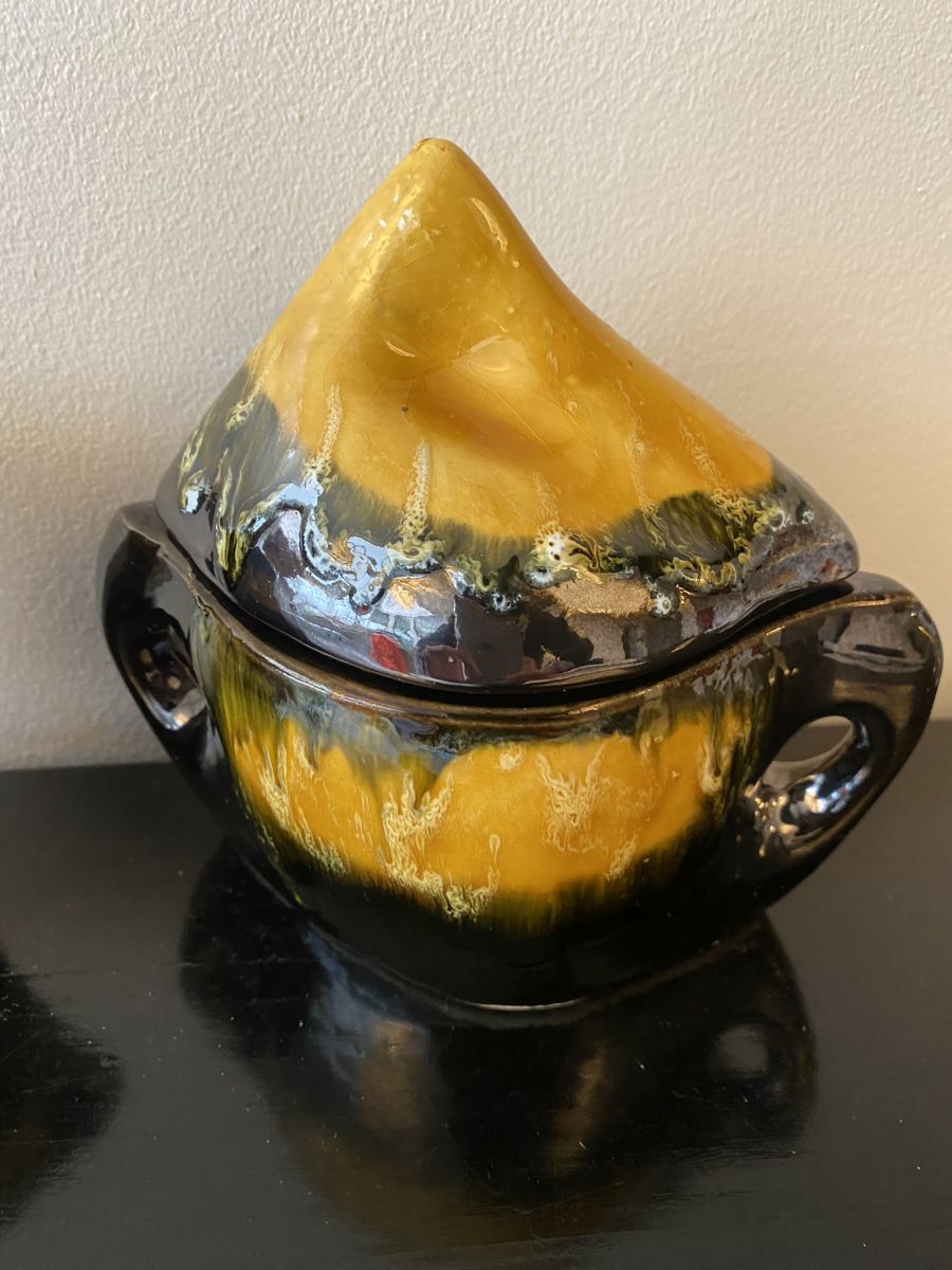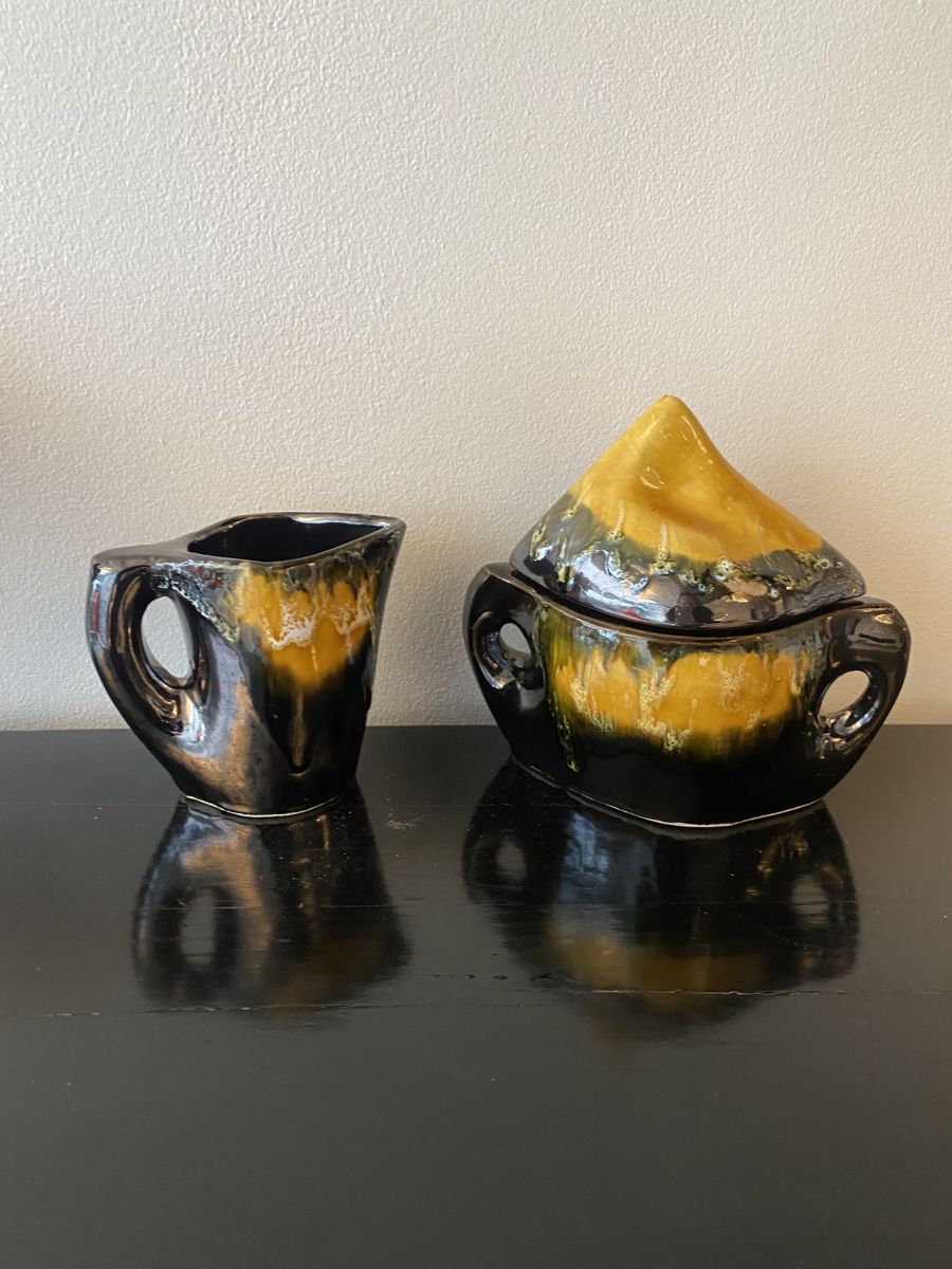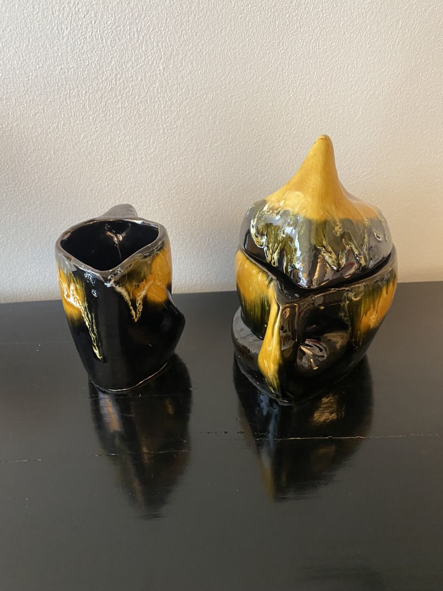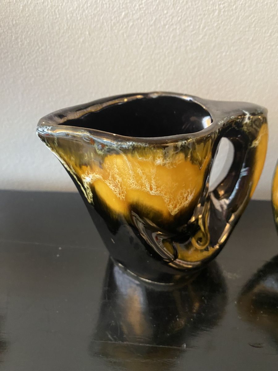 Sucrier et pot à lait Vintage de Vallauris de couleur irisée. État impeccable. Le sucrier qui peut également servir de pot ou de vide poche fait 18 cm de large et 15 cm de hauteur. La petite cruche ou pot à lait fait 11 cm de large et 9 cm de hauteur. De couleur jaune et marron irisé et signe Vallauris sous ce le dessous. Plus de photos ou d informations sur simple demande