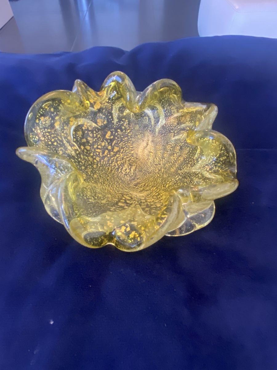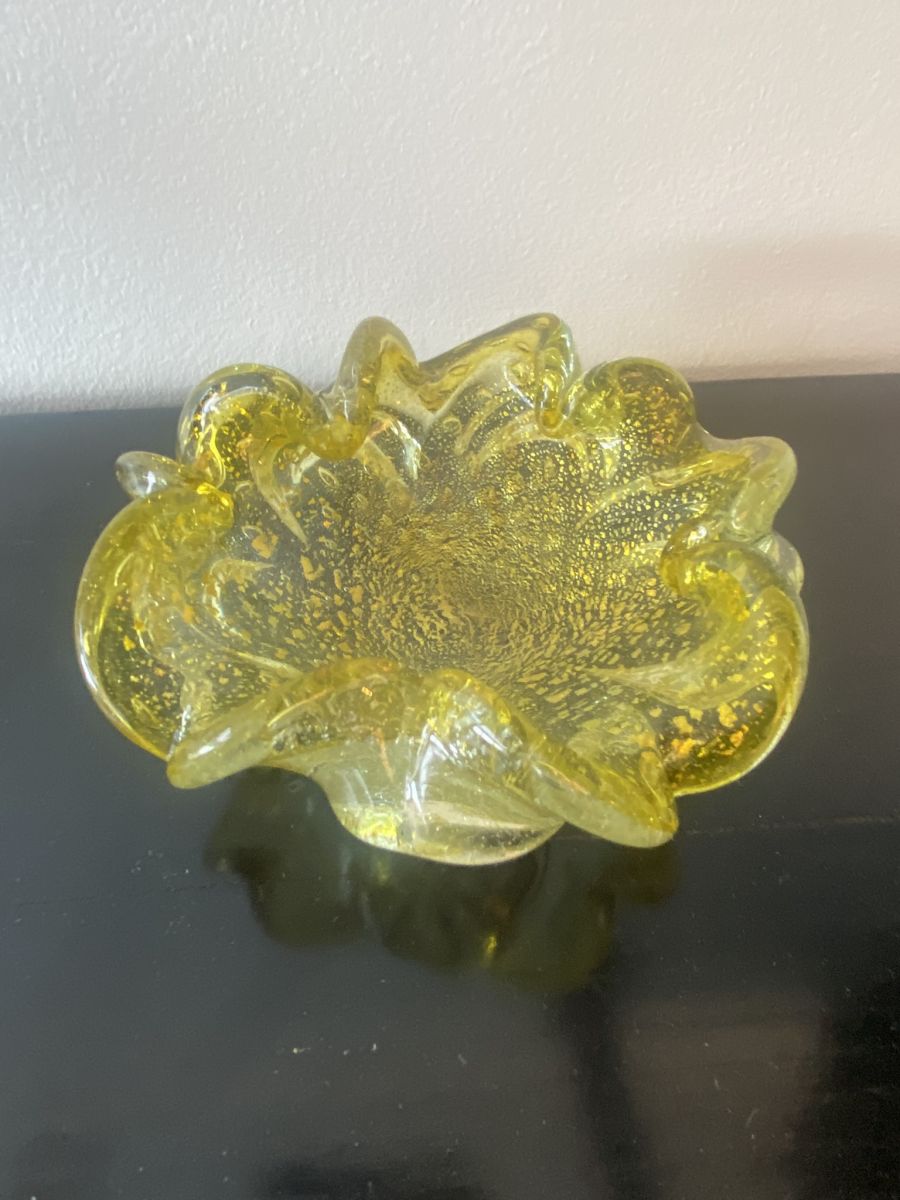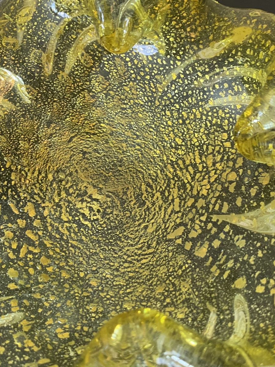 Vide poche cendrier jaune de Murano par Barovier Toso. Vintage pailleté or en excellent état. Vintage années 50/60. Incrusté de paillettes d or. Largeur de 15 cm. Plus de photos ou d’informations sur simple demande