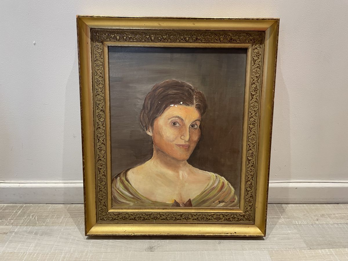 Huile sur toile, portrait de femme, quelques manques de peinture (voir photos), cadre en bois doré, dimensions (cm) : L.50xH.59xP.5, bon état général.