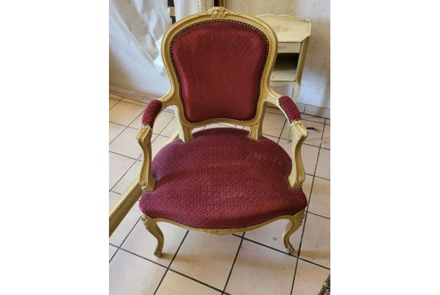 Patine bois sculpté et décoré motif floral. Tissu velours rouge en bon état. Pieds en très bon état.