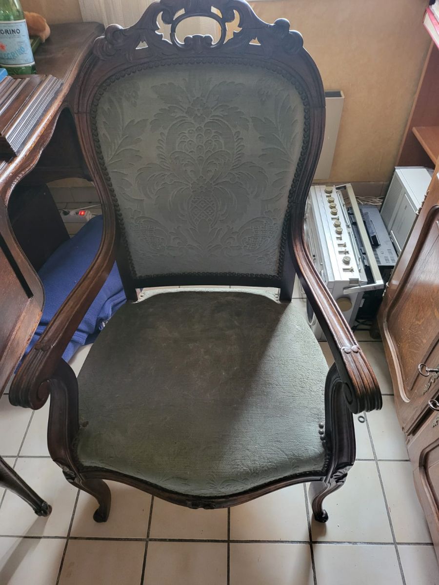 Patine bois sculpté et décoré motif floral. Tissu velours vert en bon état. Pieds en très bon état.