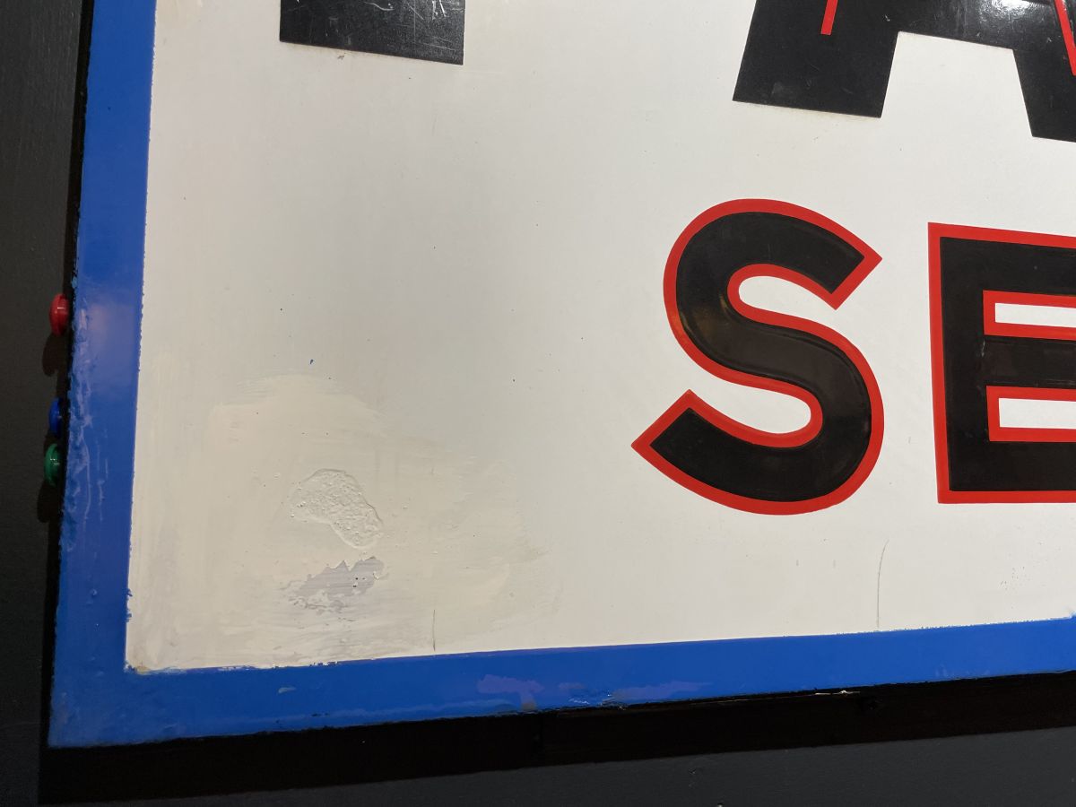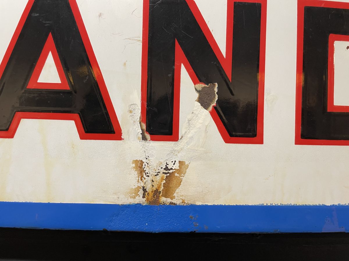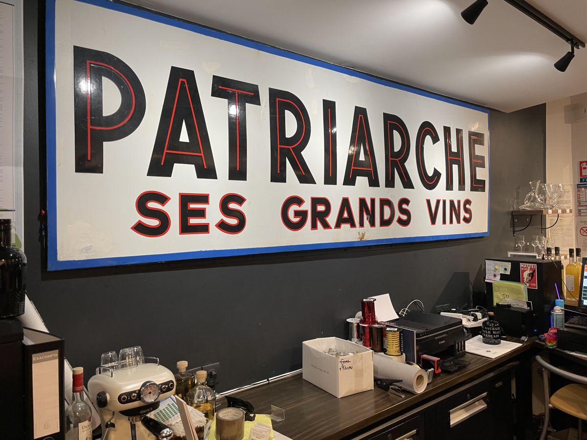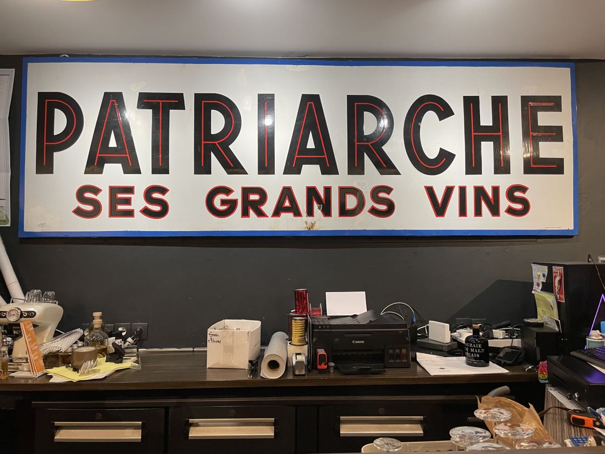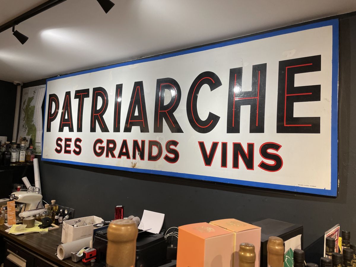 Très grande plaque émaillée pour les vins de Bourgogne de la maison Patriarche (Beaune), tricolore, traces d’usage, un peu de corrosion par endroit (voir photos), quelques retouches à la peinture blanche (récupérée comme cela, en l’état), fabriquée par Emaillerie Alsacienne Strasbourg, dimensions (cm) : L.294xH.94xP.4.