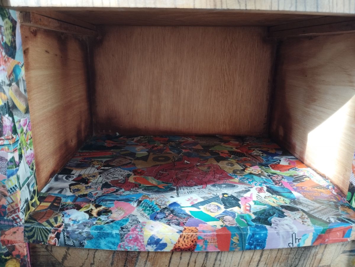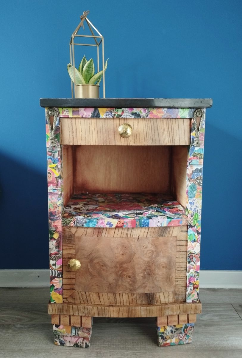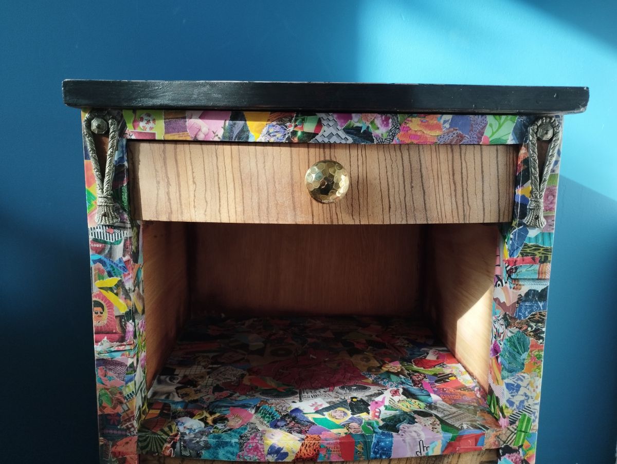 J'ai souhaité lui donner une seconde vie en utilisant la technique du collage avec des affiches et des magazines récupérés.