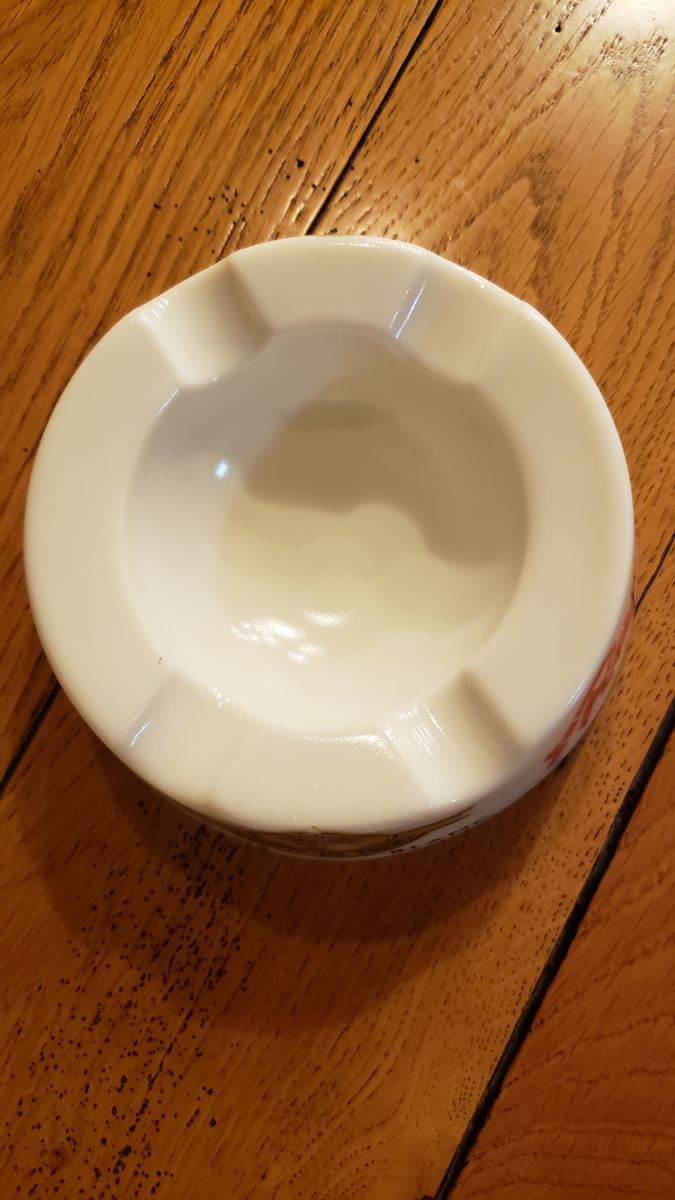 En bon état vintage (voir photos). Cendrier rond blanc/noir/rouge et doré provenant de la verrerie Magnier à Blangy.