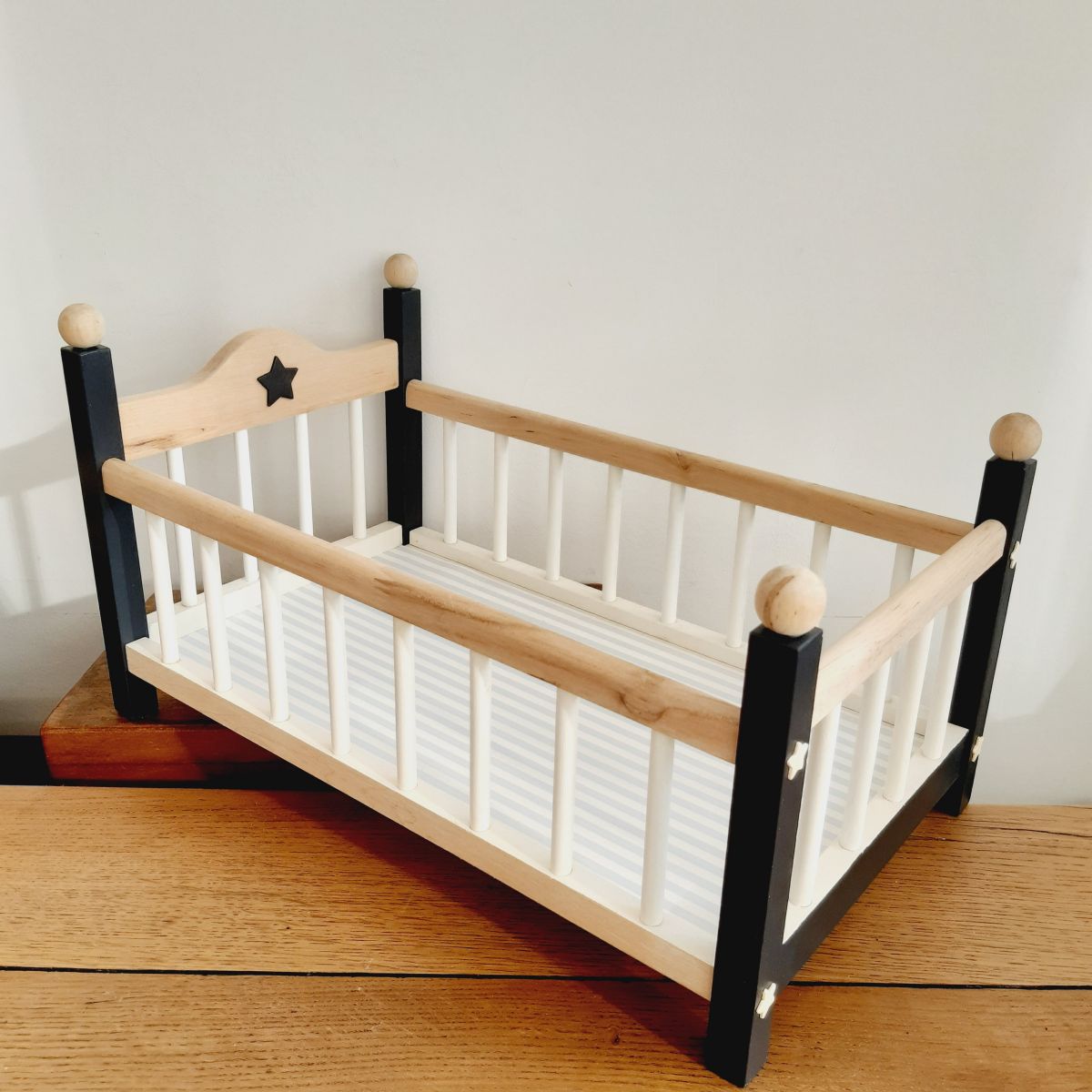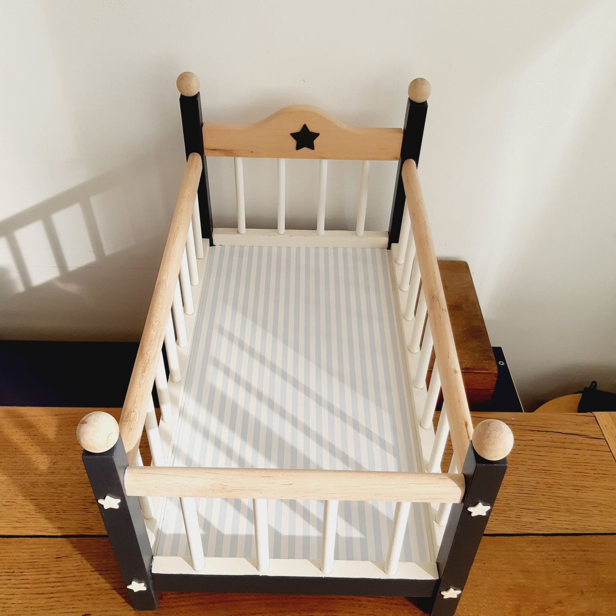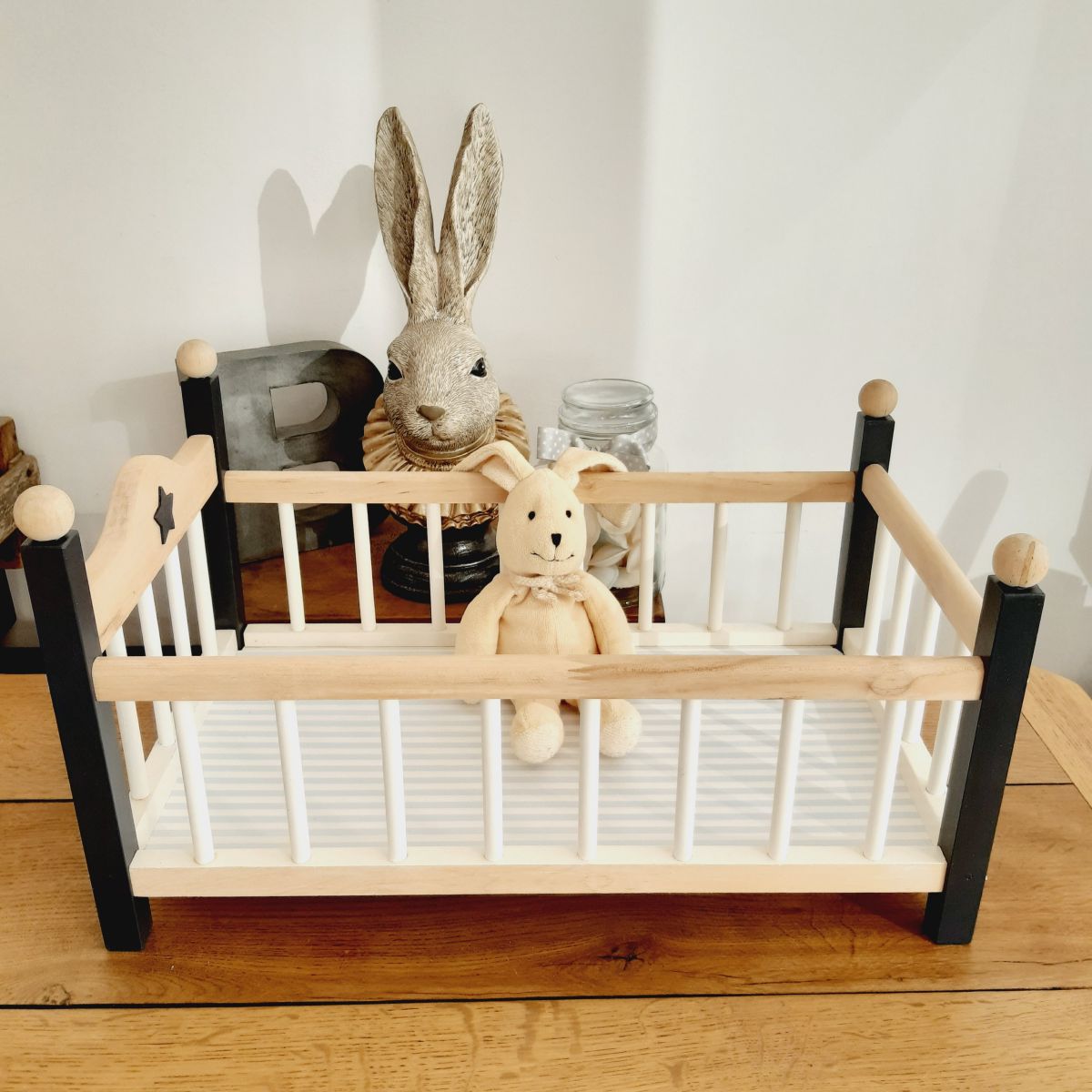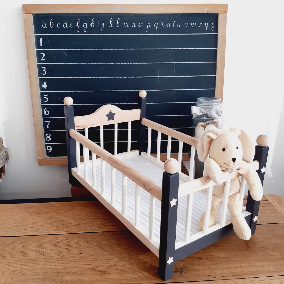 Unique et élégant ! Ce lit poupée vintage est revalorisé dans des tons gris « parisien » et blanc et bois brut. Le bois brut des têtes de lit et des encadrements supérieurs a été récupéré après un minutieux ponçage.