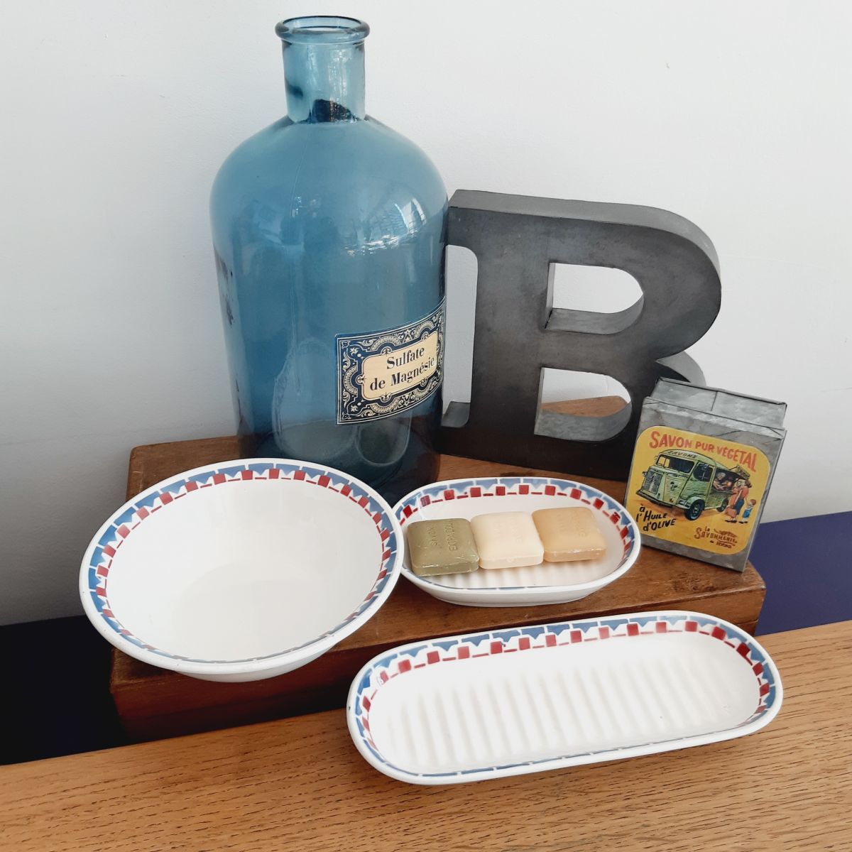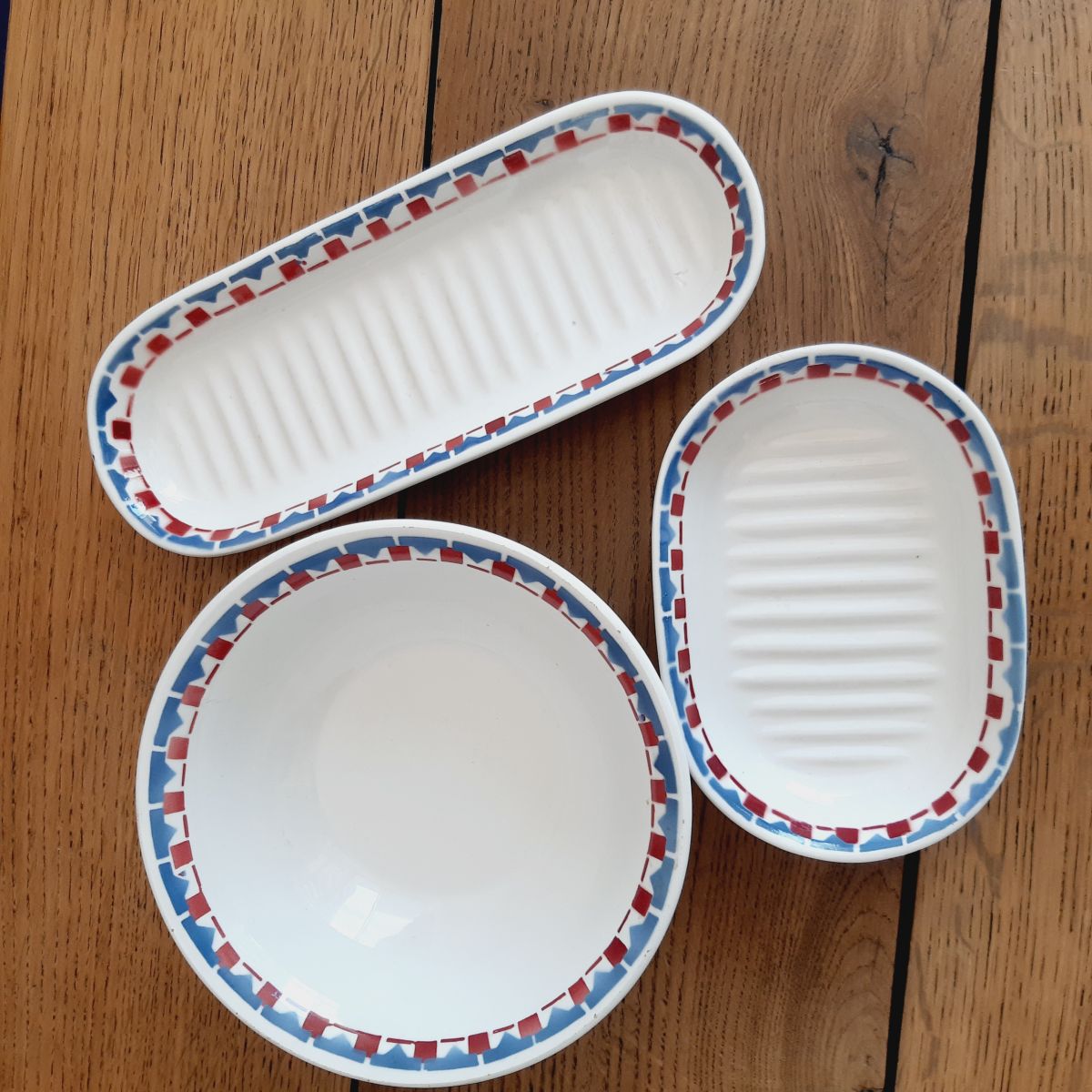 Bel ensemble de toilette Art Déco en céramique blanche et décors géométriques bleus et rouges. Le lot est composé : d’un bol à barbe, d’un porte savon et d’un porte brosse.