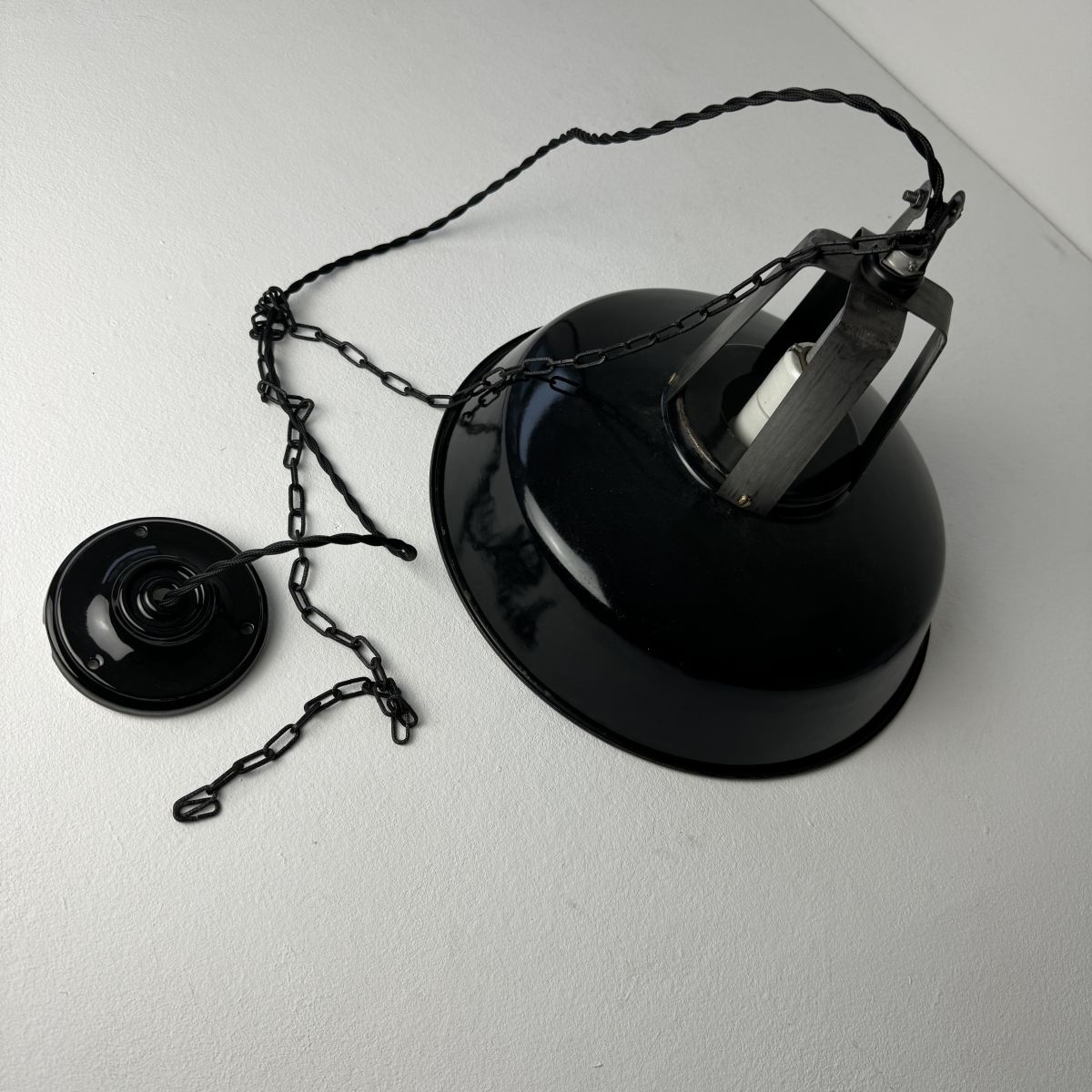Electricité refaite à neuf avec fil en tissu noir torsadé. Branchement par domino. Douille à baïonnette en céramique (B22). Présence d’une rosace de fixation en porcelaine et d’un chaîne.