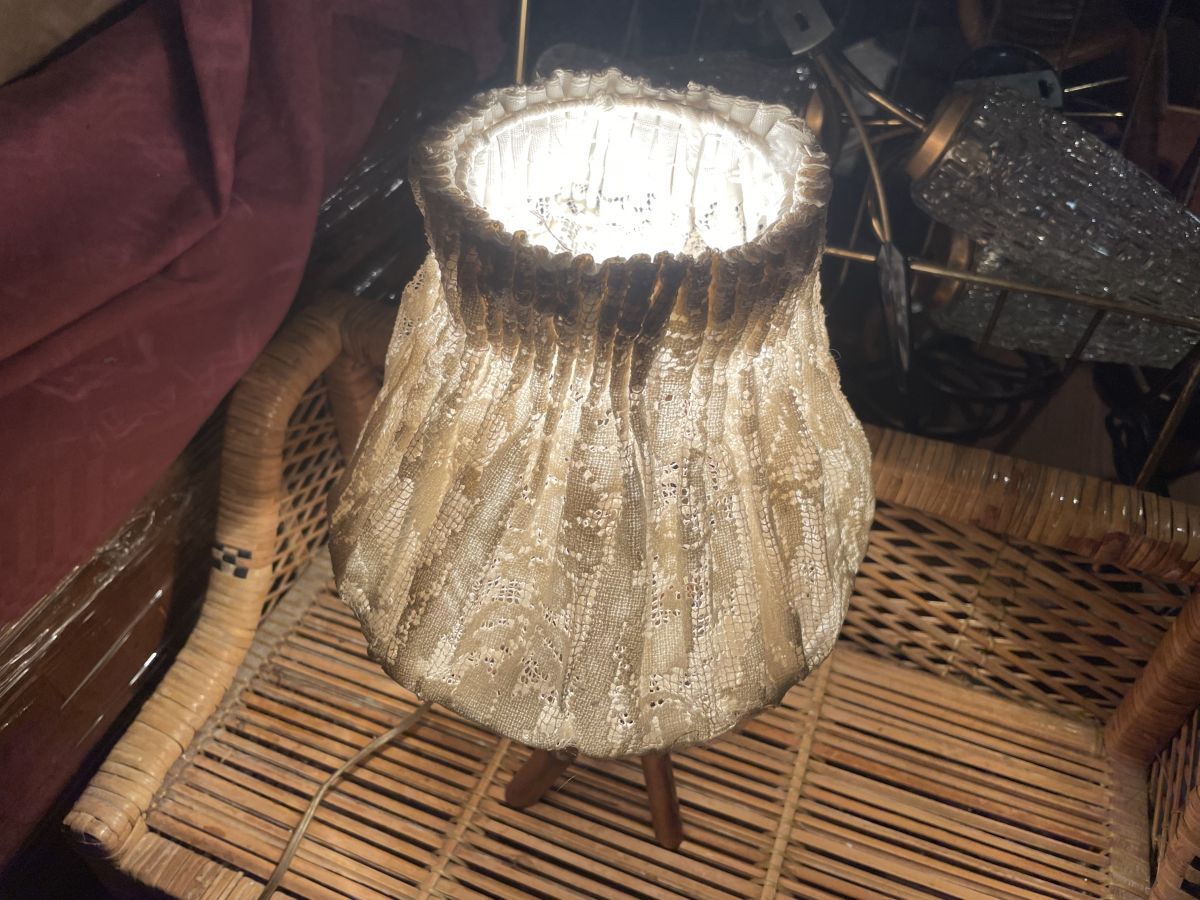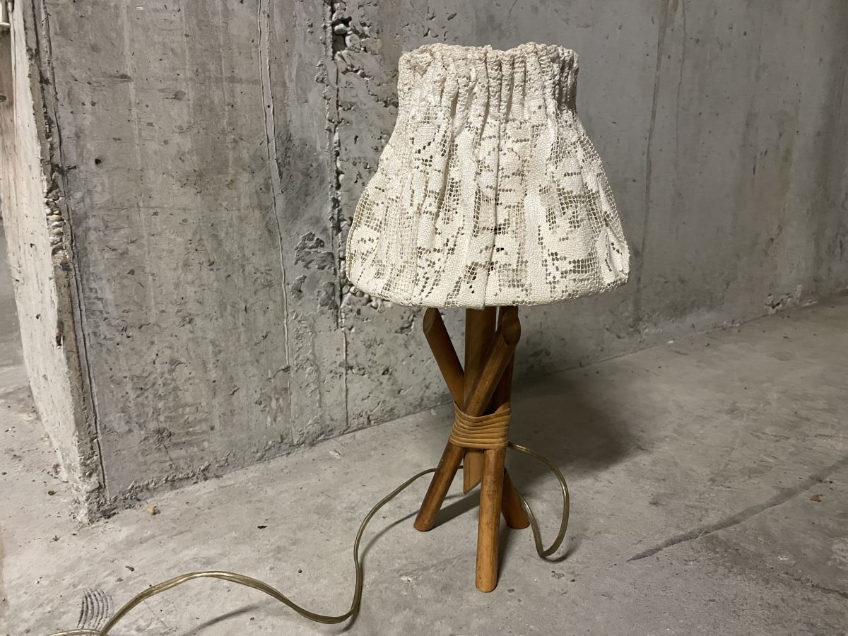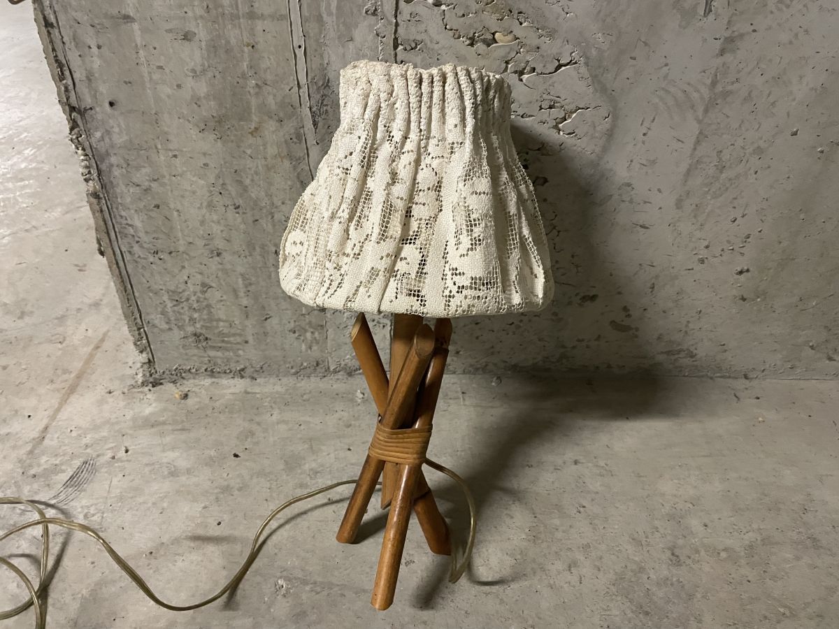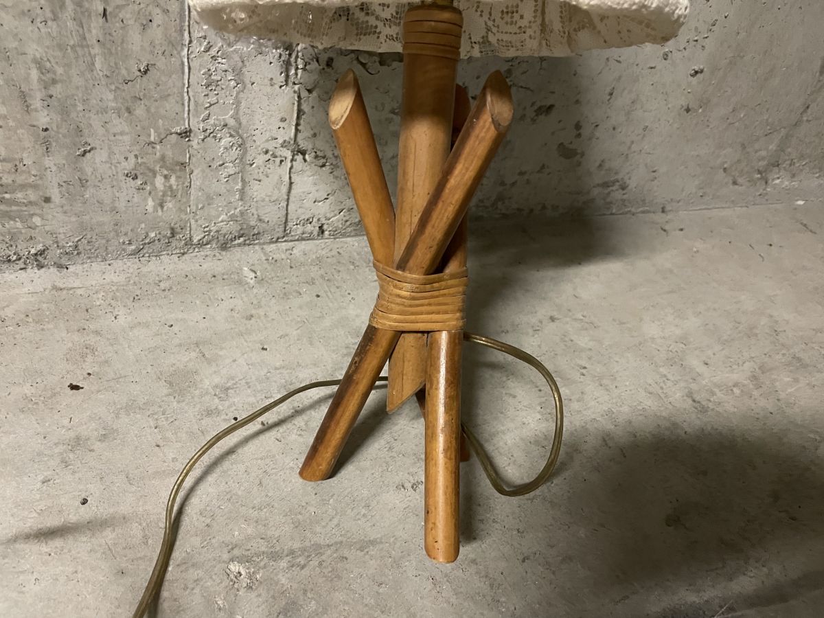Lampe de table en rotin et bambou des années 60, abat-jour en dentelle, fonctionne parfaitement, hauteur avec abat-jour 38cm (30cm sans), largeur du piètement 10cm, diamètre de l’abat-jour 20cm, bon état.