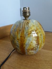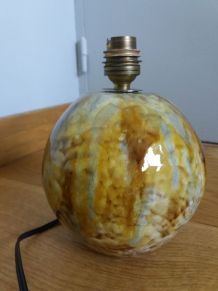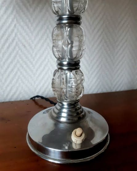 Pied de lampe vintage de style art déco composé de trois boules en verre moulé intercallées de cercles en métal argenté.