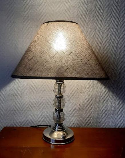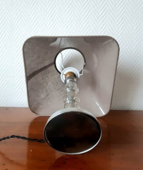 Bouton pressoir d'origine, électrification neuve et fonctionnelle en fil tissu torsadé noir et prise bakélite grise. Abat-jour crème également neuf.