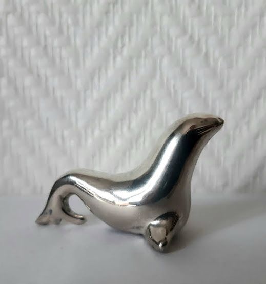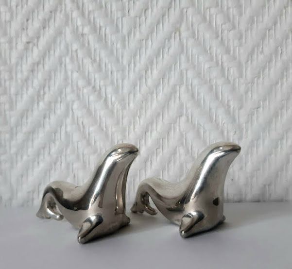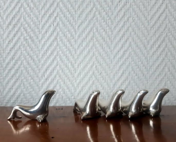 Ensemble de cinq porte-couteaux en métal argenté représentant des phoques.