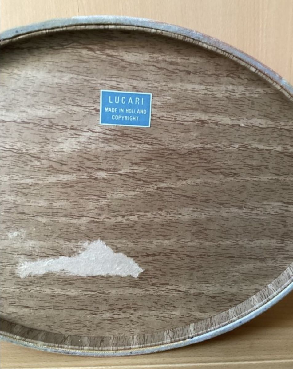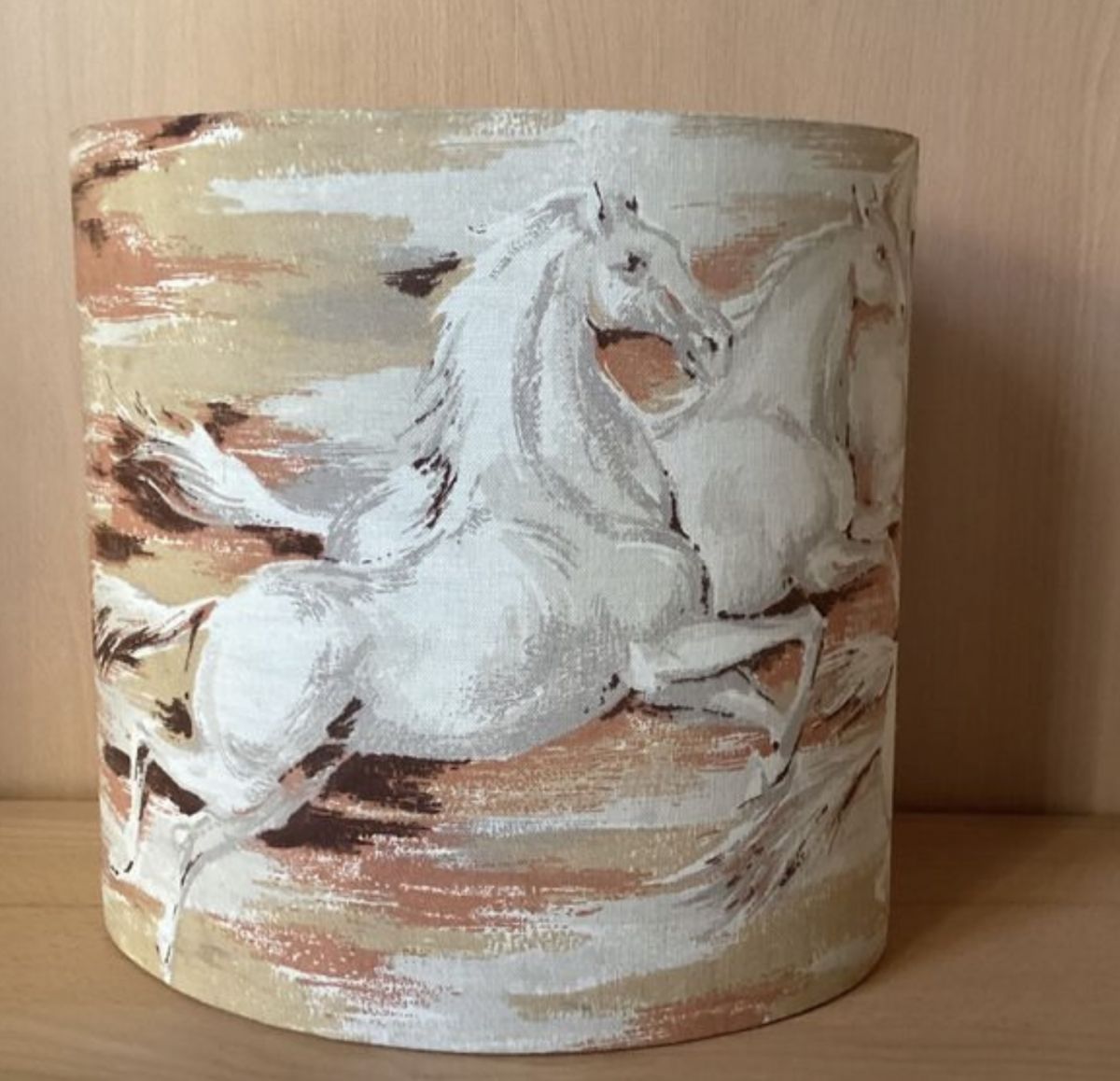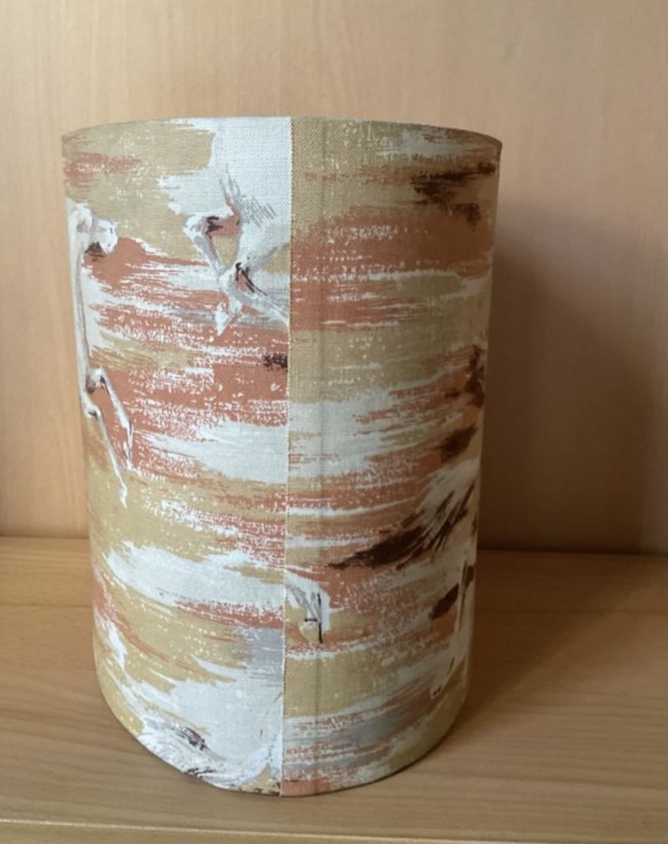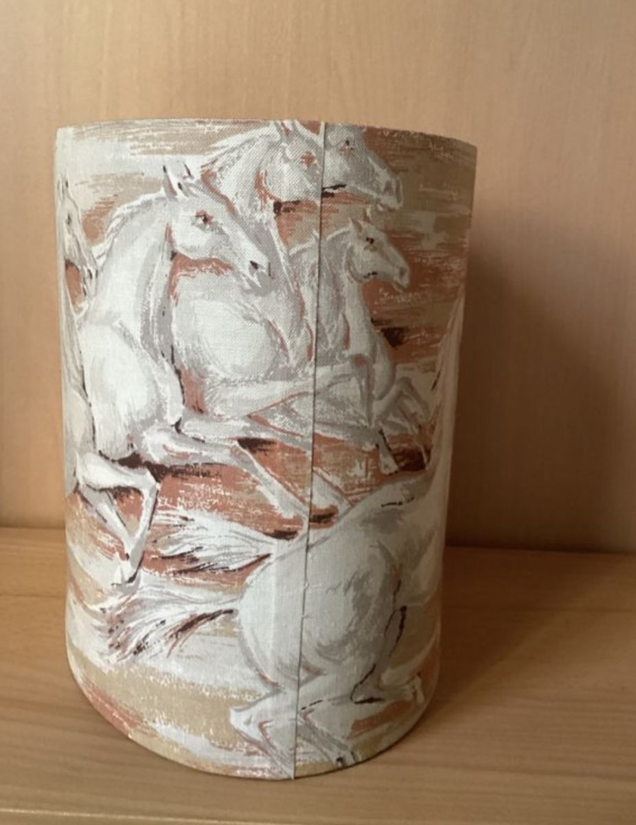 Corbeille à papier LUCARI Made in Holland copyright en carton et tissu motif chevaux au galop couleurs blanc cassé, beige, orangé et gris