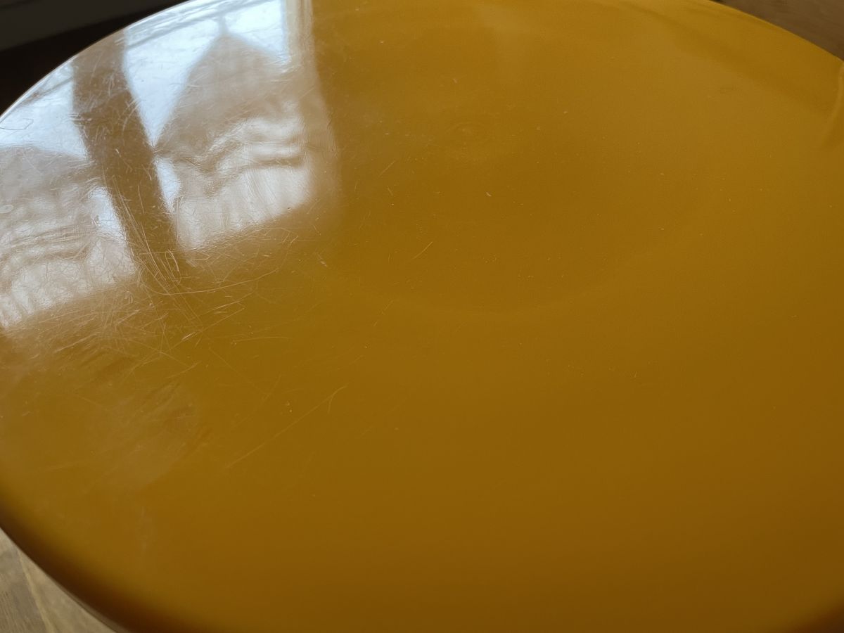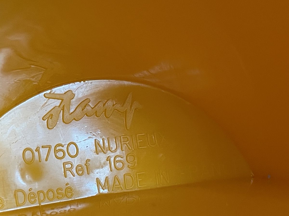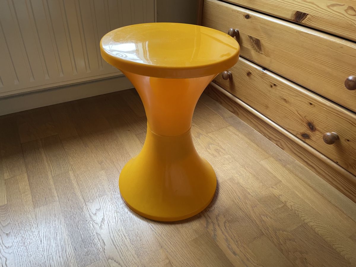 Tabouret Tam Tam de couleur orange des années 70, réf 169 manufacturé par la STAMP à Nurieux(01), estampillé, hauteur 44cm, diamètre assise 30cm, quelques légères traces d’usage sur le dessus, bon état.