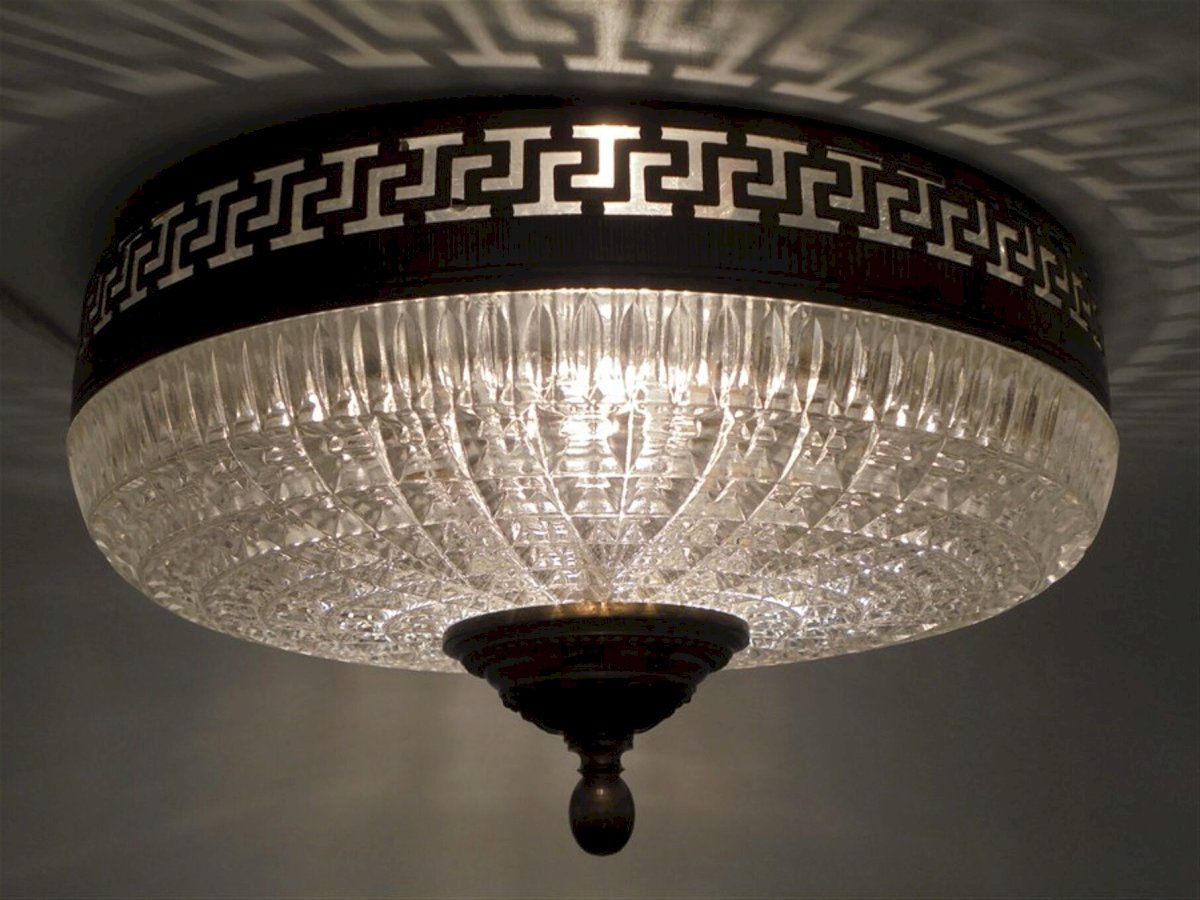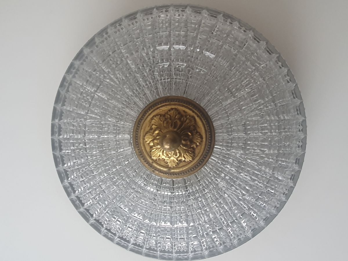 Grand et beau plafonnier vintage, Lucien Gay, modèle 660/25. En métal et verre taillé effet cristal de la célèbre maison Lucien Gau. La maison Lucien Gau est célèbre pour fournir des lumières dans les musées, les opéras, les théâtres à Paris et dans les maisons et hôtels de luxe du monde entier. Le verre ciselé est travaillé avec précision pour répartir uniformément la lumière. La partie en métal doré est ornée d'élégants motifs inspirés des frises antiques. Les parties en métal doré/ laiton sont légèrement patinées.2 douilles E14. Circa années 1950 - 1960 (60). Design classique et intemporel. Pas d'étiquette sur le luminaire.
