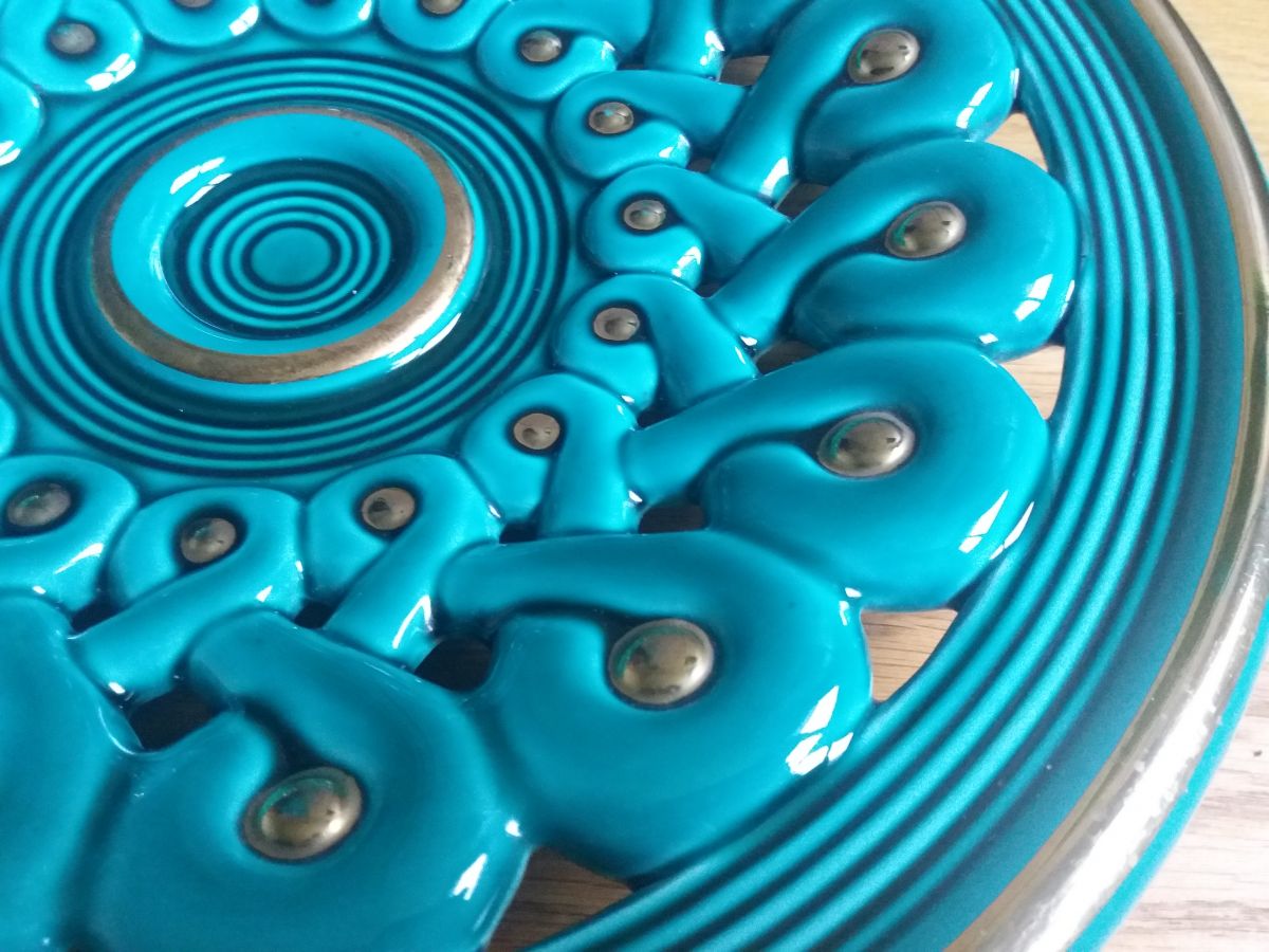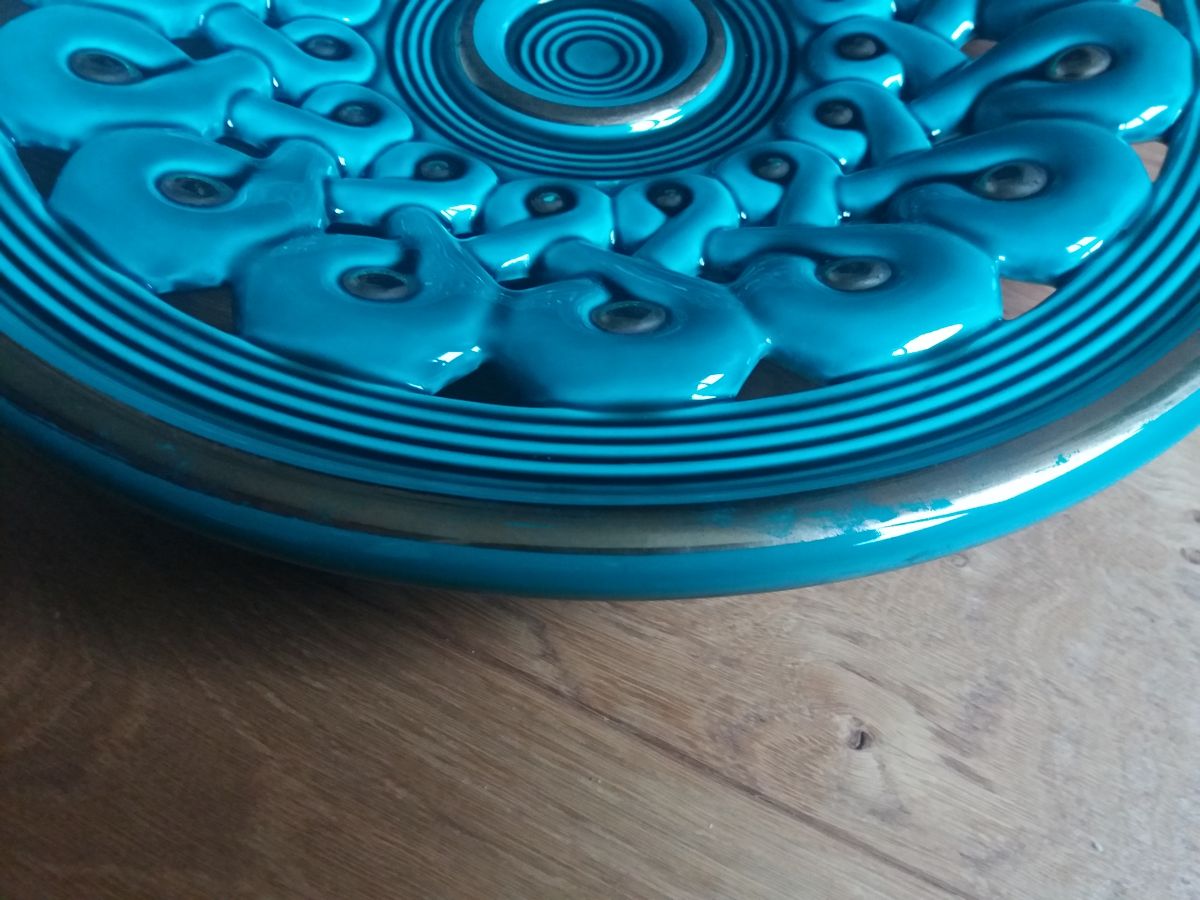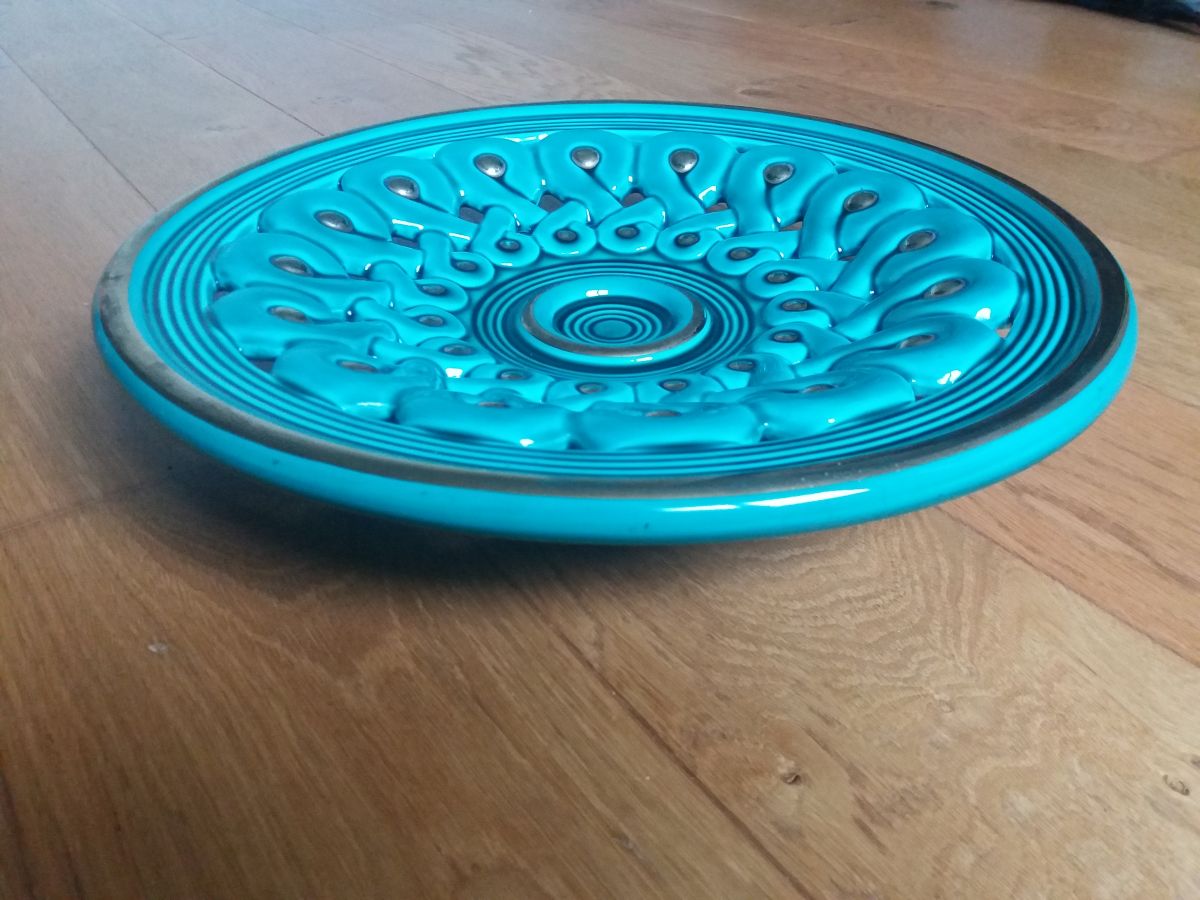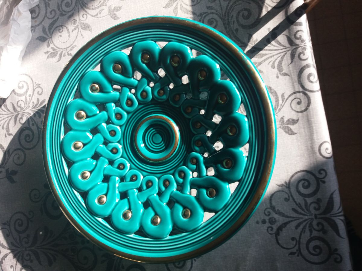 Très belle et grande coupe à fruits qui fera aussi un objet décoratif à part entière, sur une table basse par exemple. Elle ne passera pas inaperçue et ne laissera pas indifférent ! Elle est en céramique ajourée émaillée d’un très beau vert émeraude avec des motifs dorés encore bien présents (sur les rares coupes à fruit de ce modèle que l’on trouve encore, la dorure est souvent très estompée voire absente). J’ai tout tenté pour rendre sur les photos la couleur réelle, mais c’est malheureusement impossible ! La première photo est celle où la couleur est la plus proche de la réalité, mais ce n’est toujours pas exactement la vraie couleur, c’est vraiment un vert entre l’émeraude et le vert d’eau foncé. C’est un très beau travail de céramique ajourée grâce aux jolies torsades qui le composent. Le cachet dessous nous indique que cette coupe provient de la maison Verceram, de fabrication française. Ce modèle daterait des années 1930 à 1940 et ferait donc partie de la production la plus précoce de Verceram, ce qui tend à être confirmé par ses lignes de style art déco. Cette coupe est en très bel état pour son âge : ni fêle ni éclat, pas même une égrenure. Les seuls signes qui témoignent de sa longue vie se trouvent sur la dorure : de petites zones où la dorure est estompée sur le grand cercle extérieur, quelques taches sur le petit cercle intérieur (ces taches relativement peu voyantes peuvent probablement être nettoyées à l'acétone, mais j’ai préféré de pas trop insister sur ce nettoyage pour ne pas risquer d’estomper davantage la dorure). Et un «petit point doré » présente un petit manque de dorure. Elle mesure 37 cm de diamètre, 6, 5 cm de hauteur et pèse 2, 1 kg.