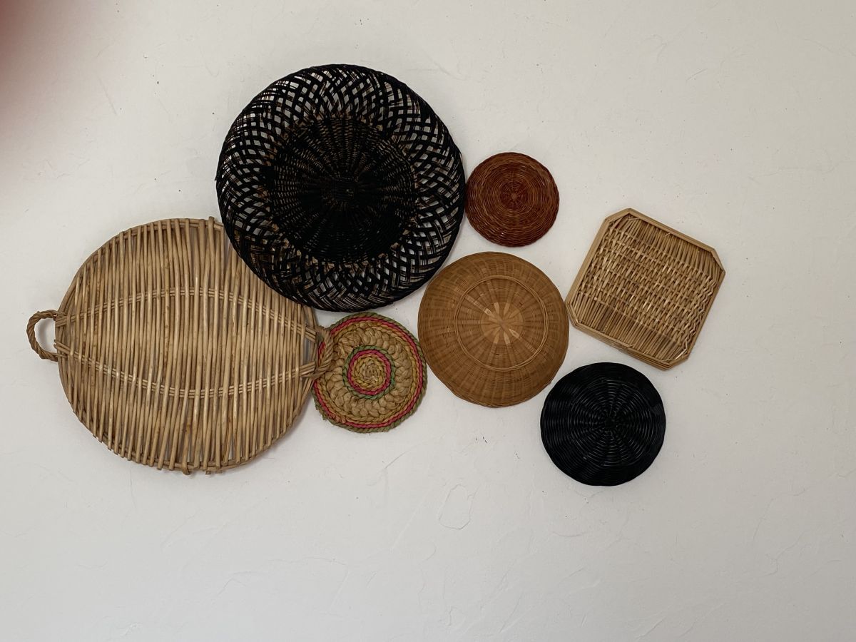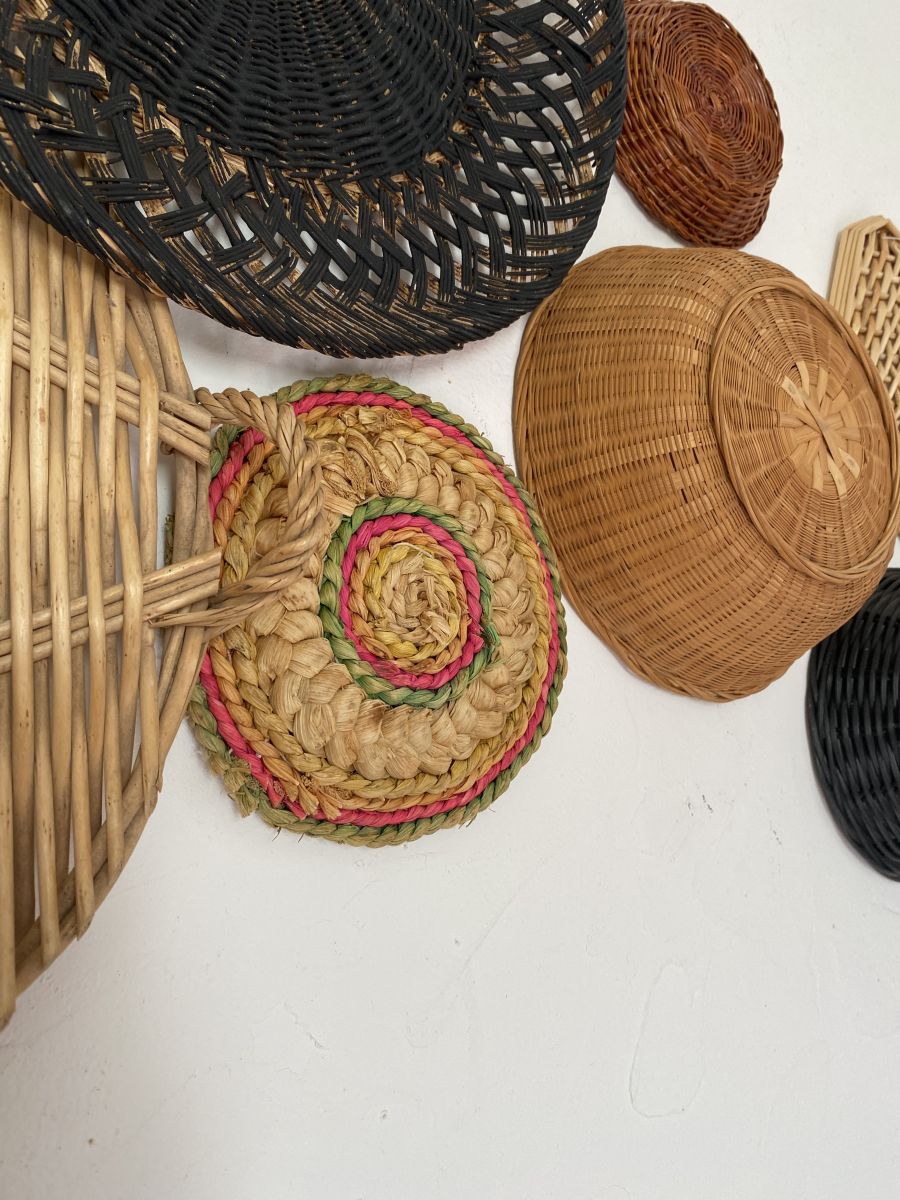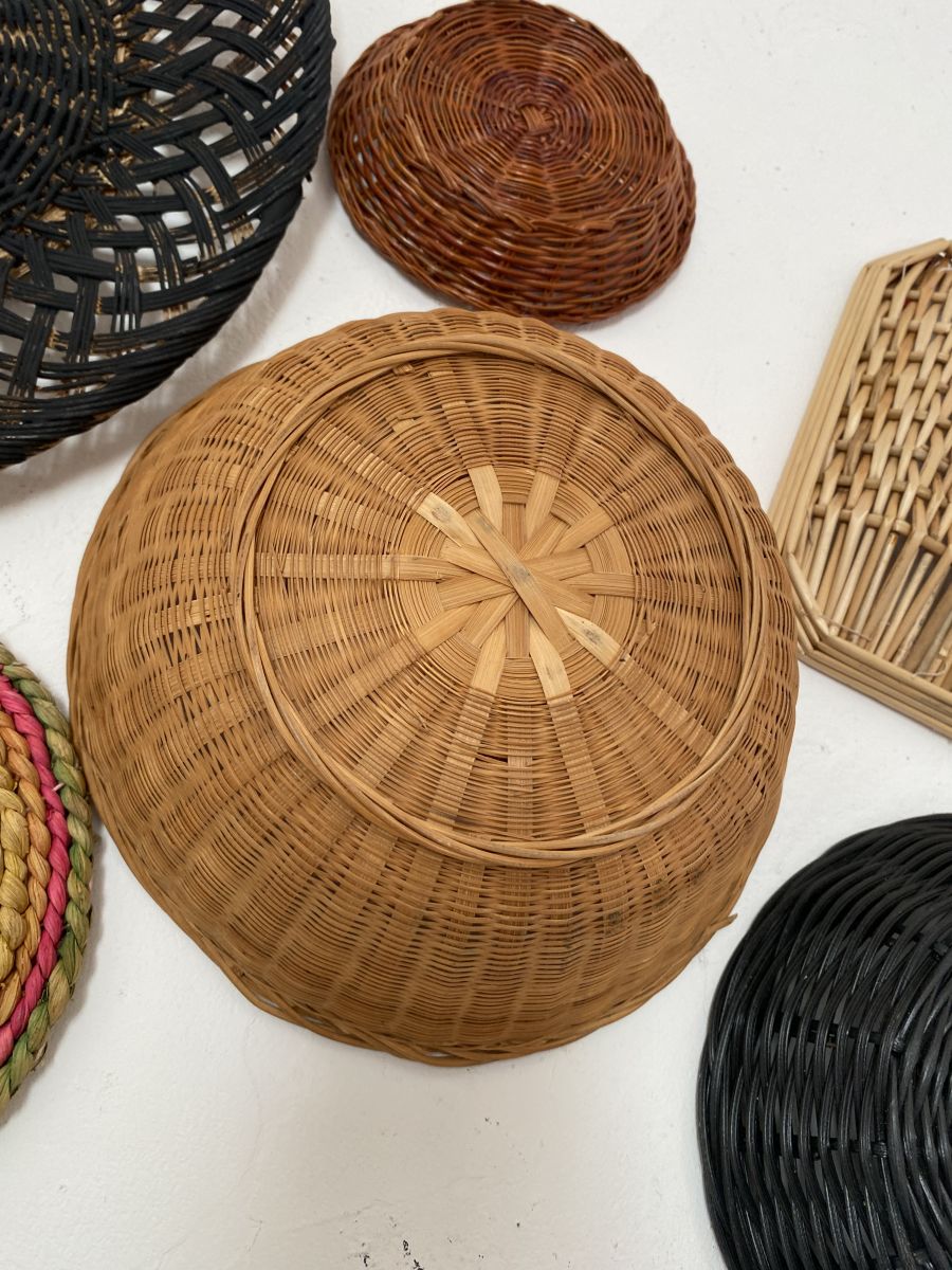 Composition murale de 7 corbeilles et plateaux en osier .