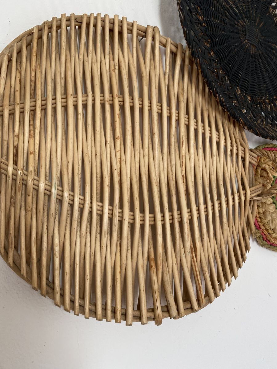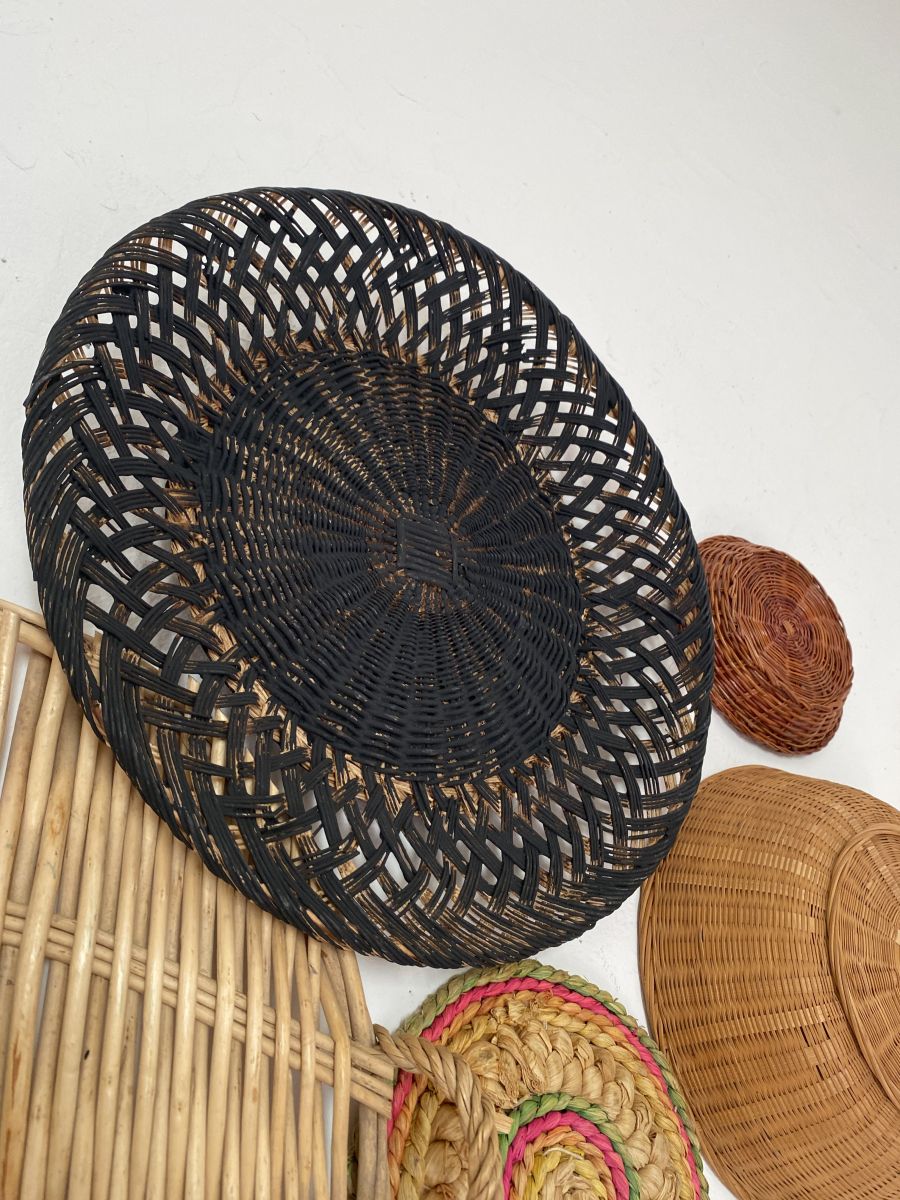 Ambiance bohème avec cette composition murale de 7 corbeilles et plateaux en osier naturel ou noir.A disposer et re disposer selon l’inspiration du moment.