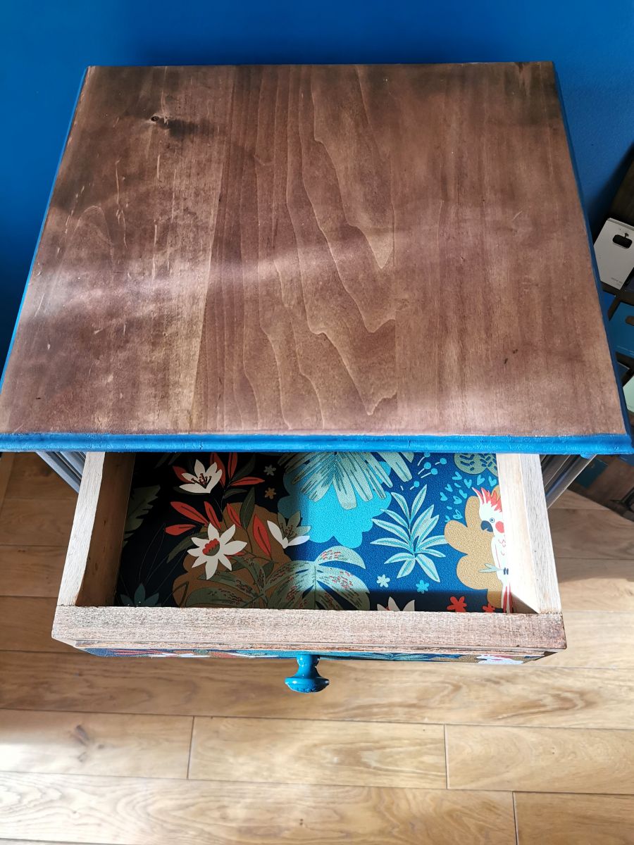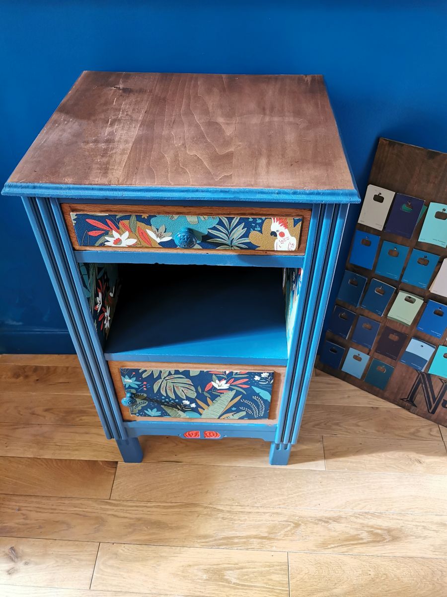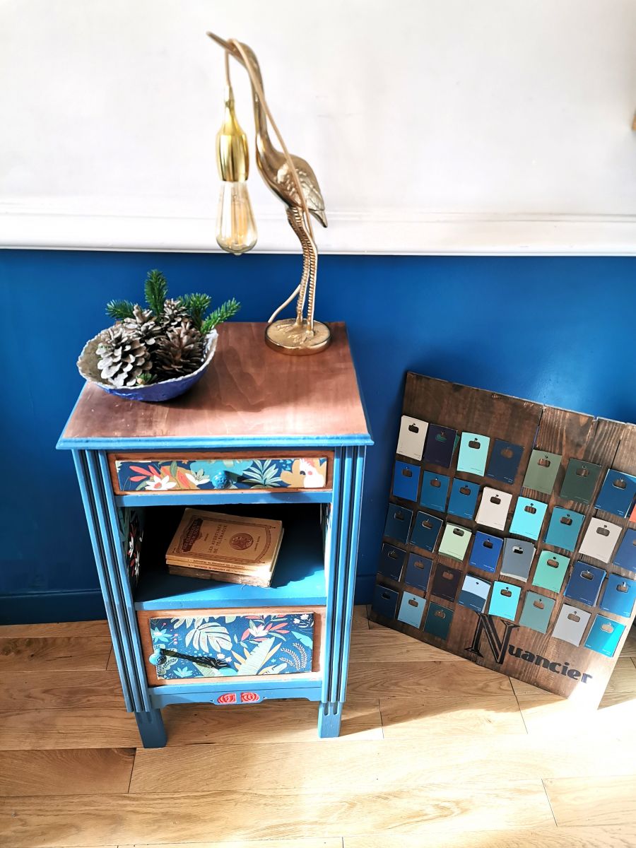 Le bleu de chine s’associe au bois sombre et au motif végétal de la niche et du tiroir.