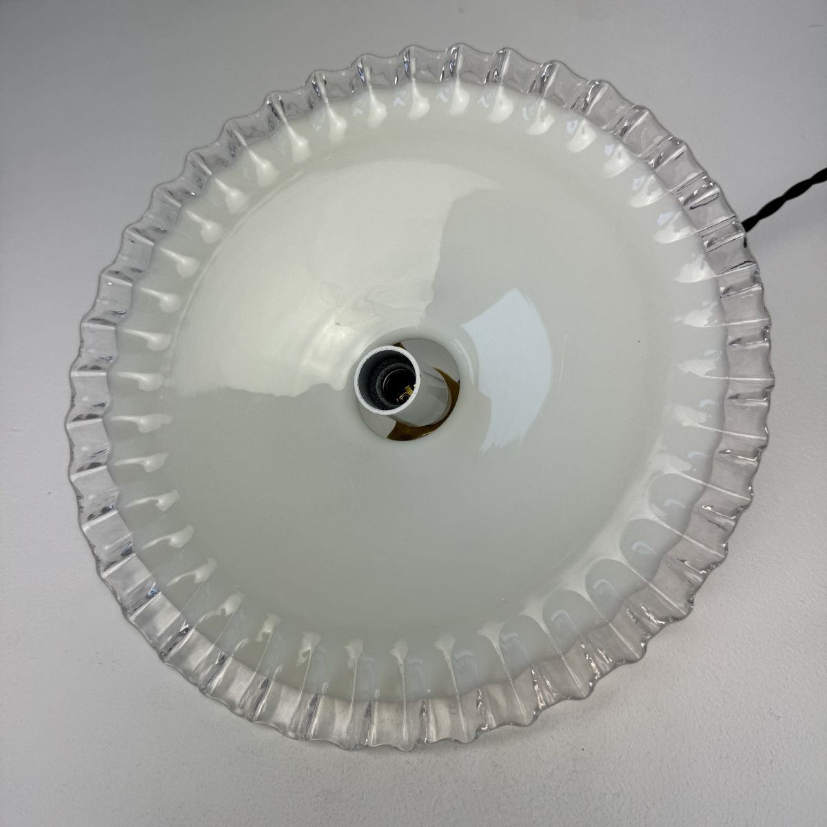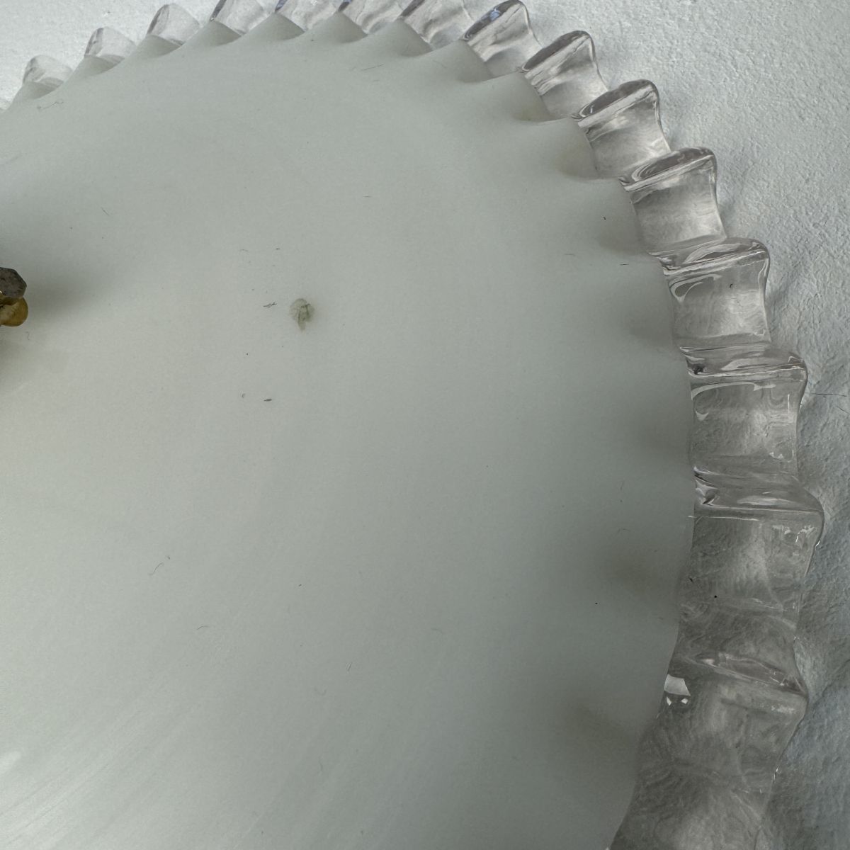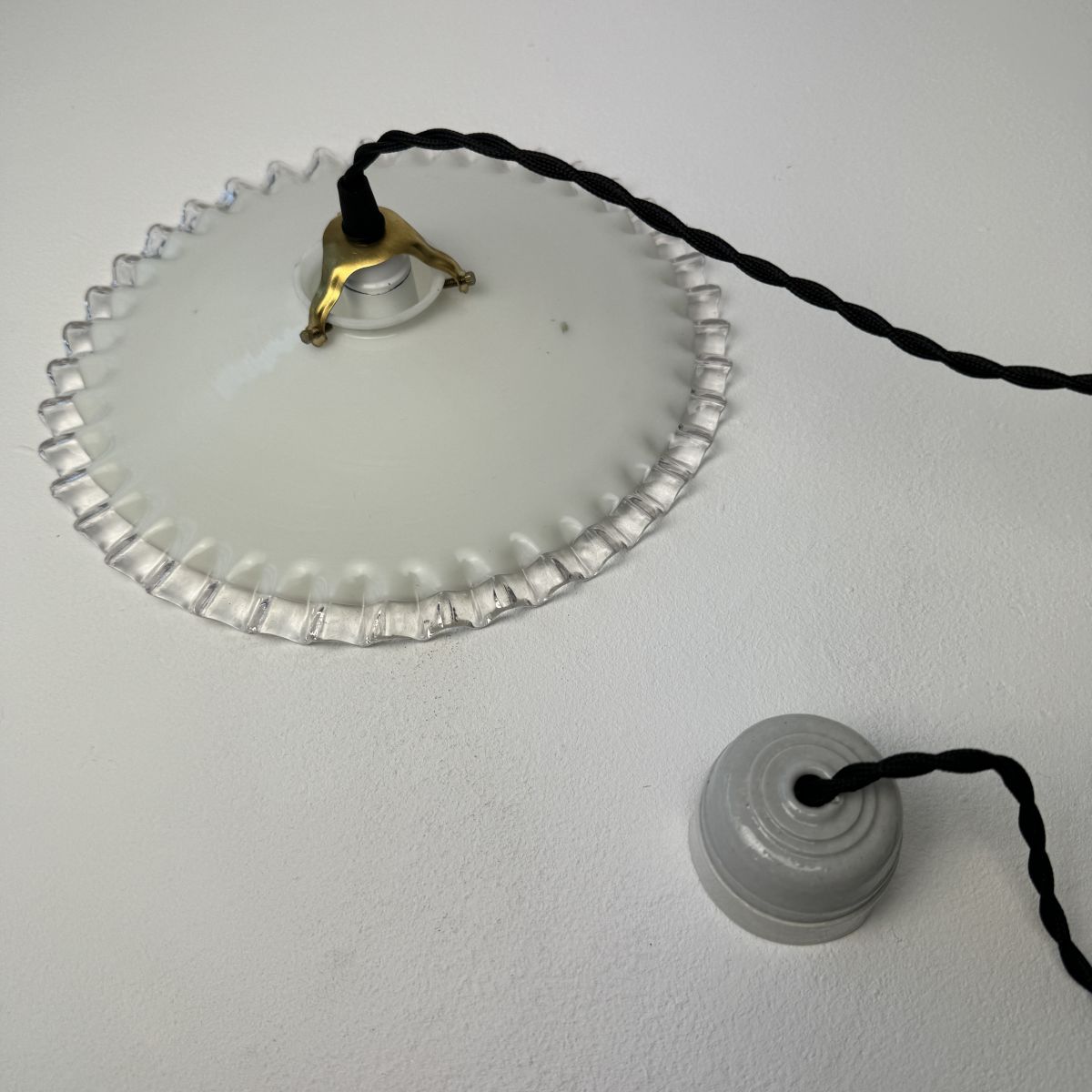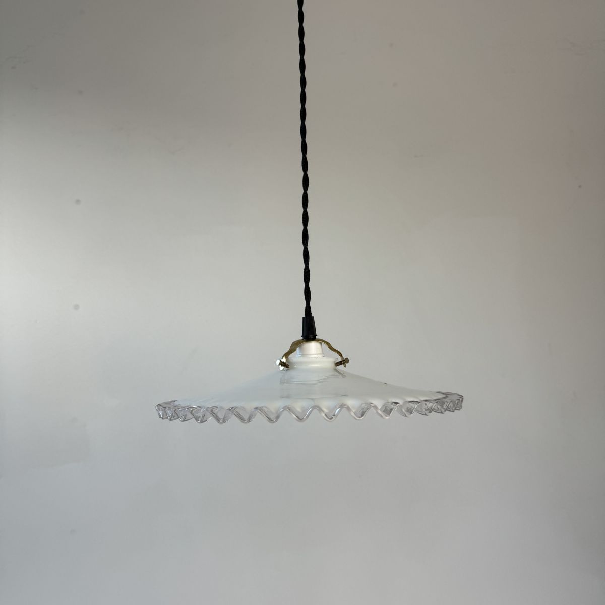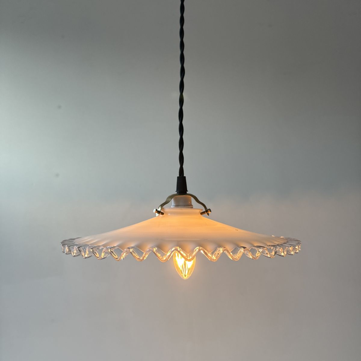 Ancienne suspension vintage en opaline dentelée. Quelques défauts, marques sur le dessus de l’opaline (voir photos)