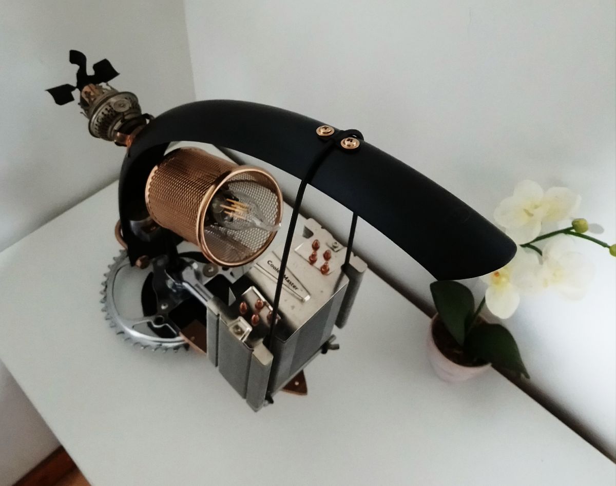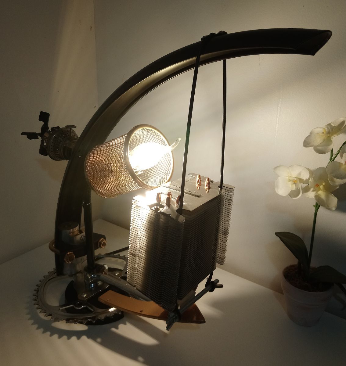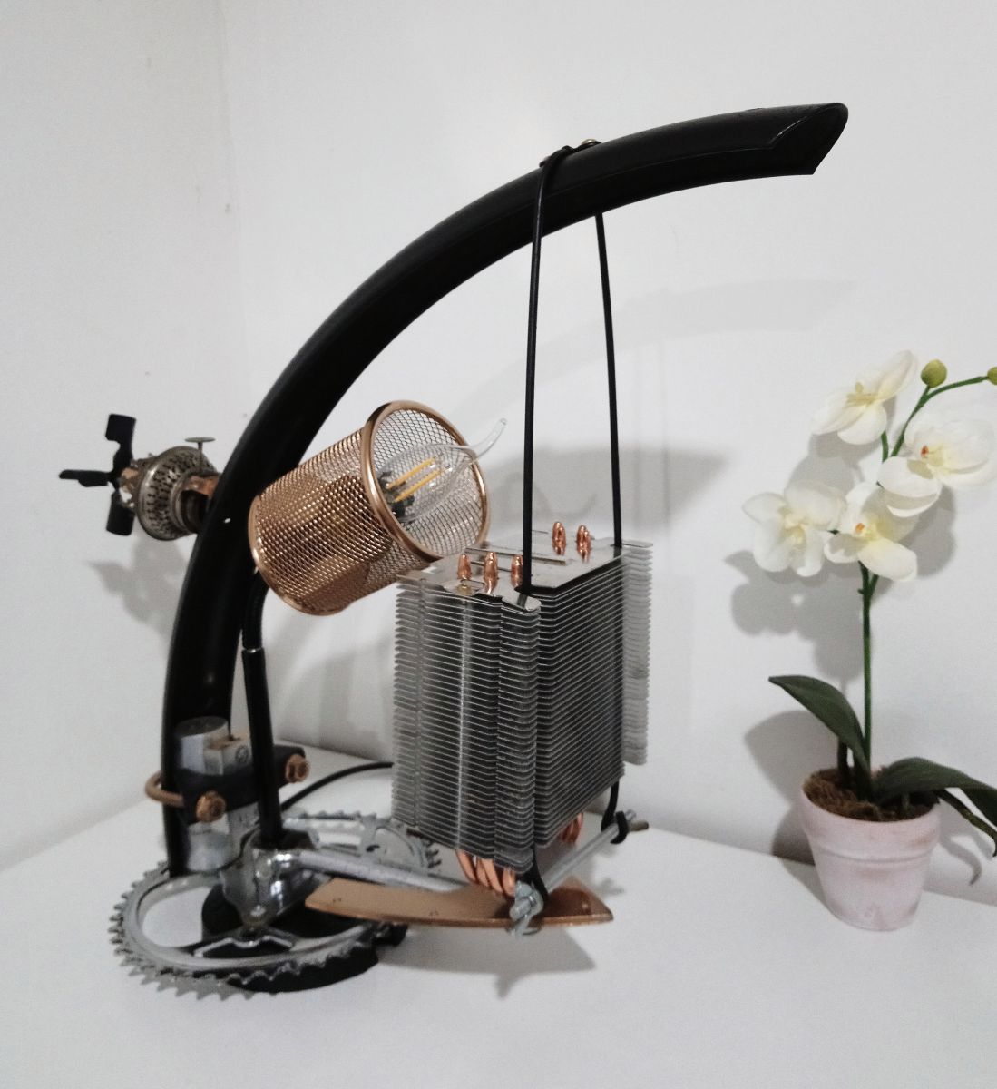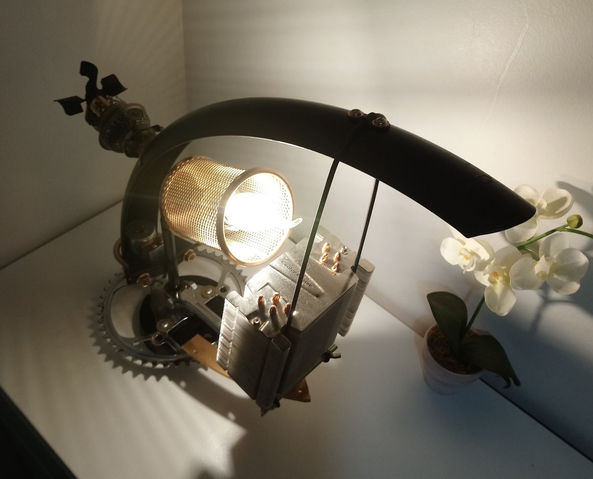 Lampe à poser artisanale récup' façon steampunk, conçue sur la base d'un pédalier et d'un garde-boue de vélo.