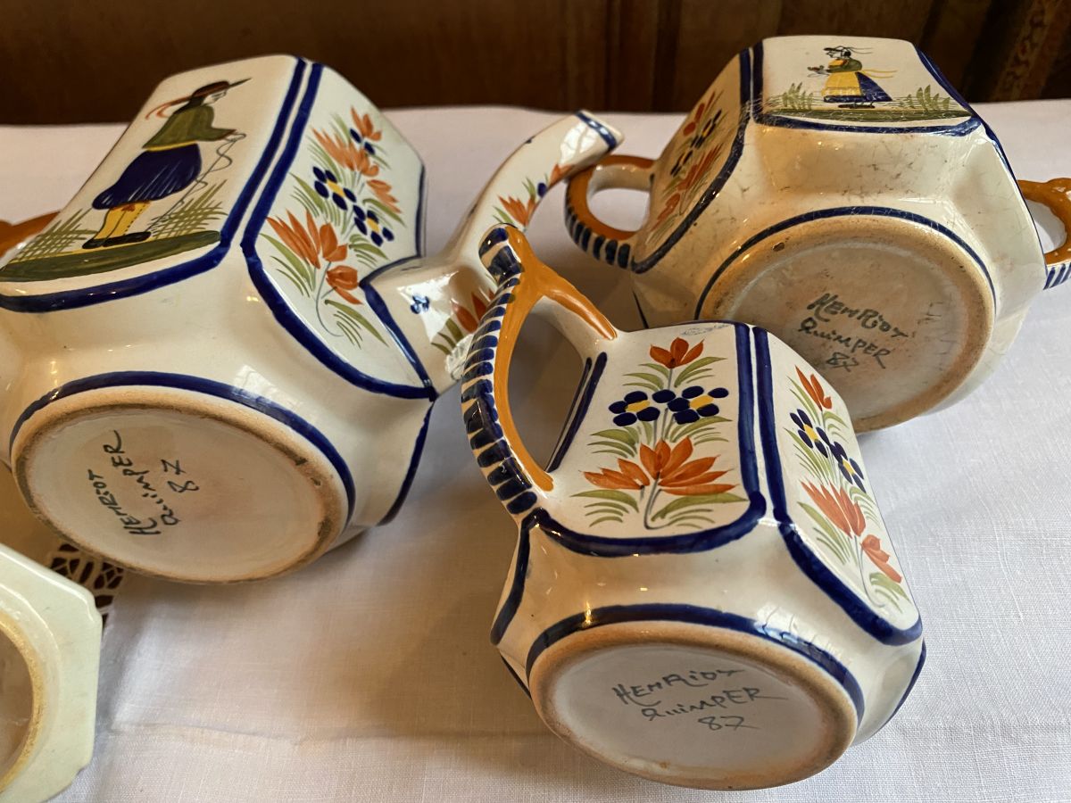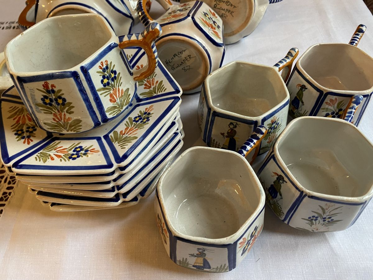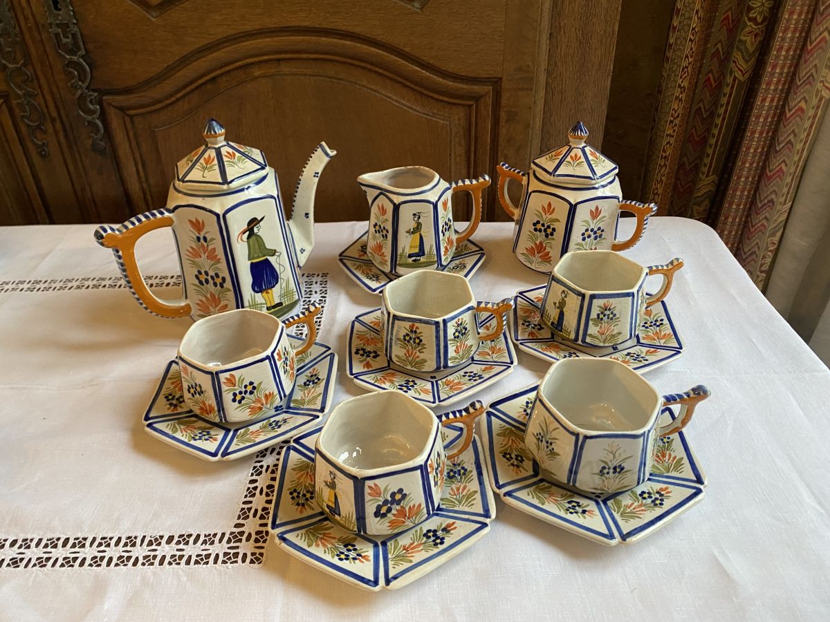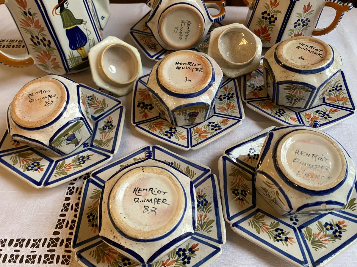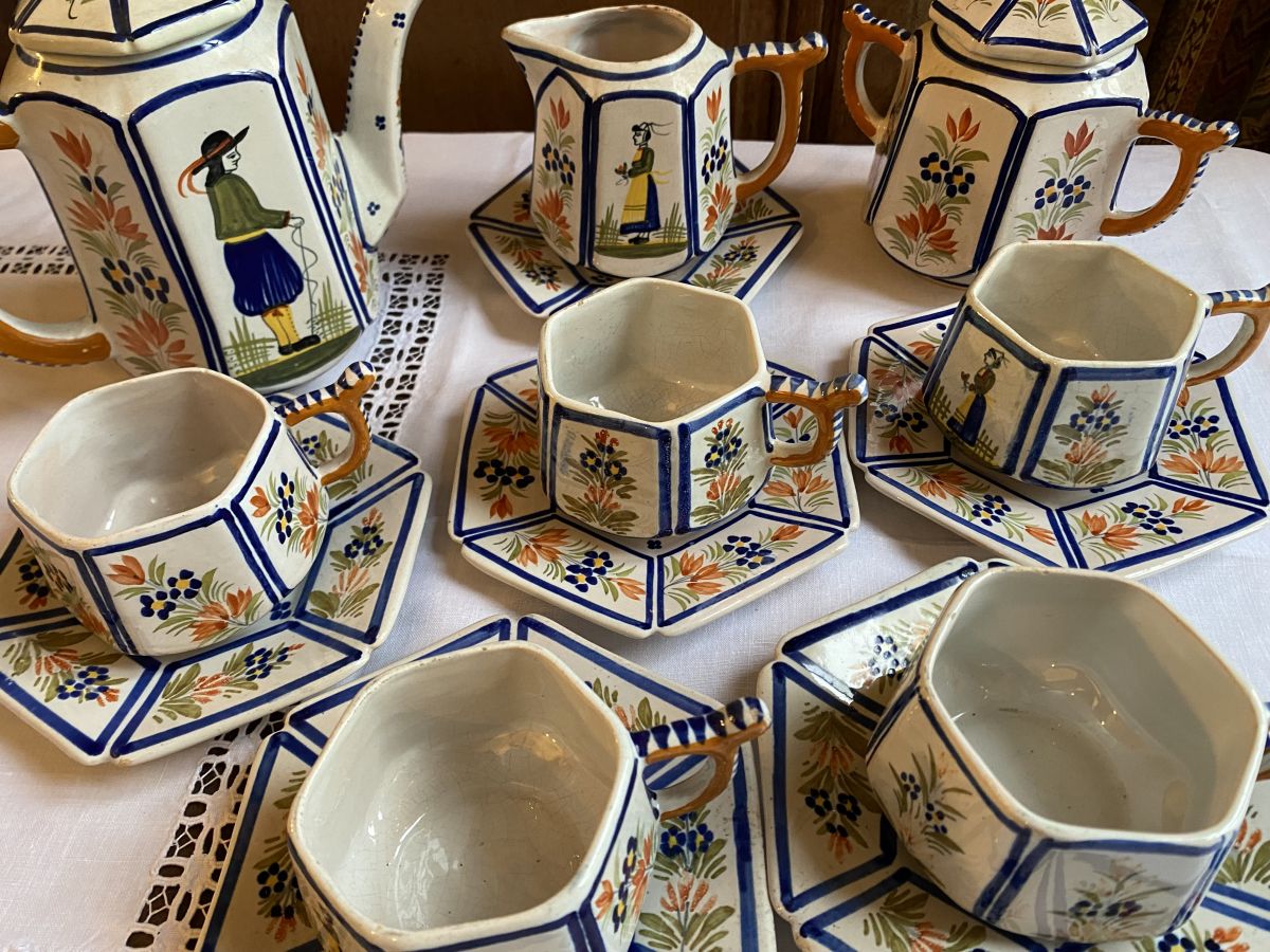 Service à thé ou à chocolat Henriot Quimper, décoré de personnages à costume traditionnel breton et motifs floraux (fond beige et multicolore).