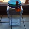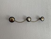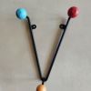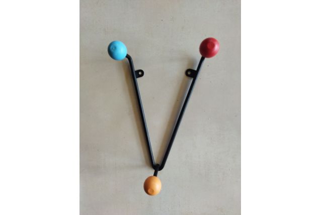 Trois boules en bois multicolore (avec minies traces d'usage) sur un cadre noir en métal.